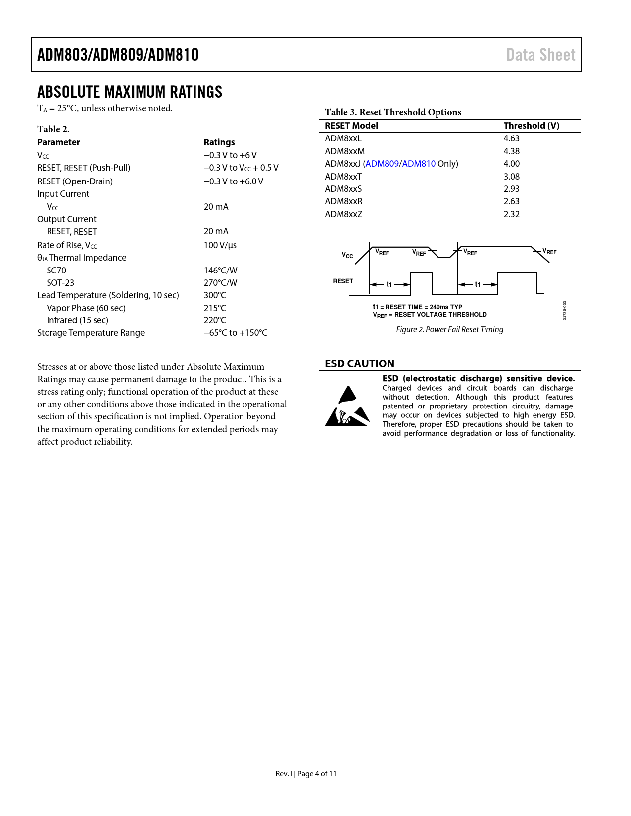 Pages / Page11 / 4 — ADM803/ADM809/ADM810. Data Sheet. ABSOLUTE MAXIMUM RATINGS. Table 3. …