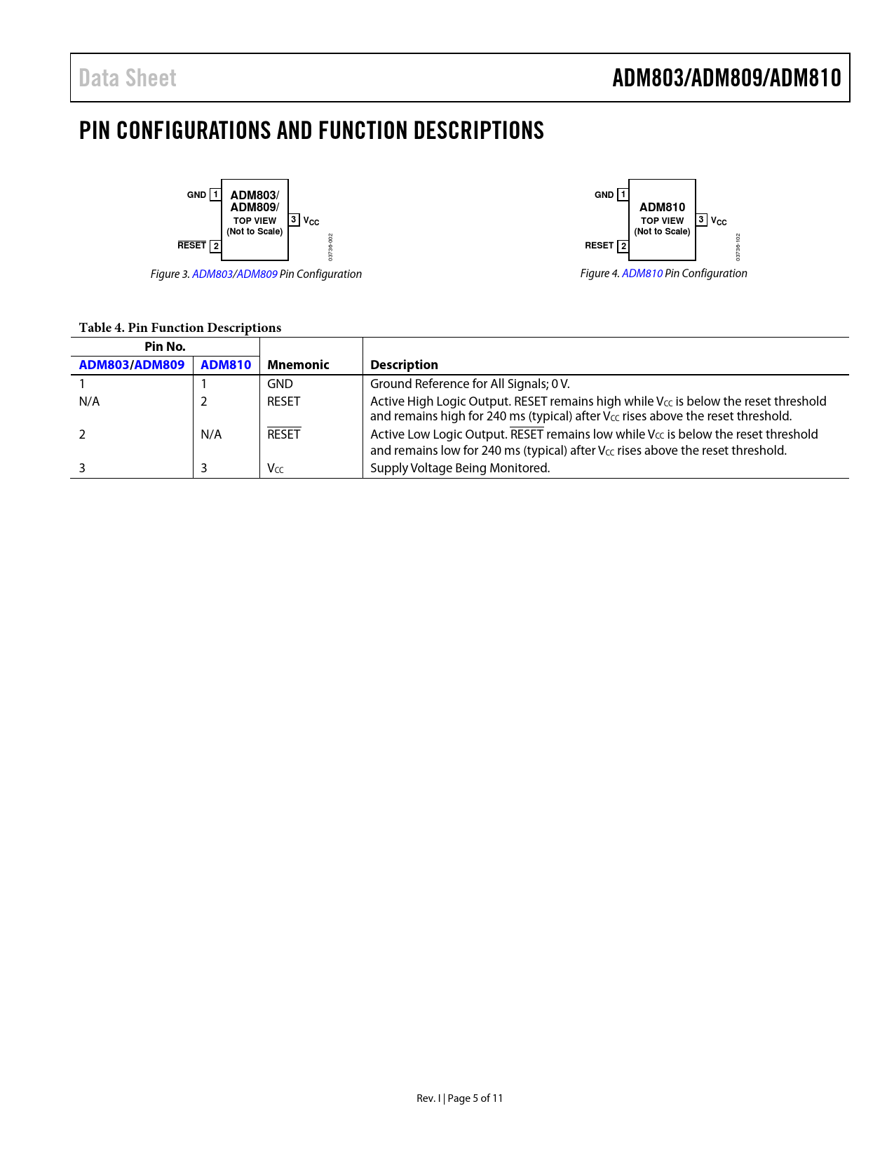 Data SheetADM803/ADM809/ADM810PIN CONFIGURATIONS AND FUNCTION DESCRIPTIONSGND 1ADM803/GND 1ADM809/ADM810TOP VIEW3 VCCTOP VIEW3 VCC(Not to Scale)(Not to Scale) 002 102 RESET 2RESET 2 03736- 03736- Figure 3. ADM803/ADM809 Pin Configuration Figure 4. ADM810 Pin Configuration Table 4. Pin Function DescriptionsPin No.ADM803/ADM809ADM810MnemonicDescription 1 1 GND Ground Reference for All Signals; 0 V. N/A 2 RESET Active High Logic Output. RESET remains high while VCC is below the reset threshold and remains high for 240 ms (typical) after VCC rises above the reset threshold. 2 N/A RESET Active Low Logic Output. RESET remains low while VCC is below the reset threshold and remains low for 240 ms (typical) after VCC rises above the reset threshold. 3 3 VCC Supply Voltage Being Monitored. Rev. I | Page 5 of 11 Document Outline FEATURES APPLICATIONS FUNCTIONAL BLOCK DIAGRAMS GENERAL DESCRIPTION TABLE OF CONTENTS REVISION HISTORY SPECIFICATIONS ABSOLUTE MAXIMUM RATINGS ESD CAUTION PIN CONFIGURATIONS AND FUNCTION DESCRIPTIONS TYPICAL PERFORMANCE CHARACTERISTICS INTERFACING TO OTHER DEVICES ENSURING A VALID RESET OUTPUT DOWN TO VCC = 0 V BENEFITS OF AN ACCURATE RESET THRESHOLD INTERFACING TO MICROPROCESSORS WITH MULTIPLE INTERRUPTS OUTLINE DIMENSIONS ORDERING GUIDE