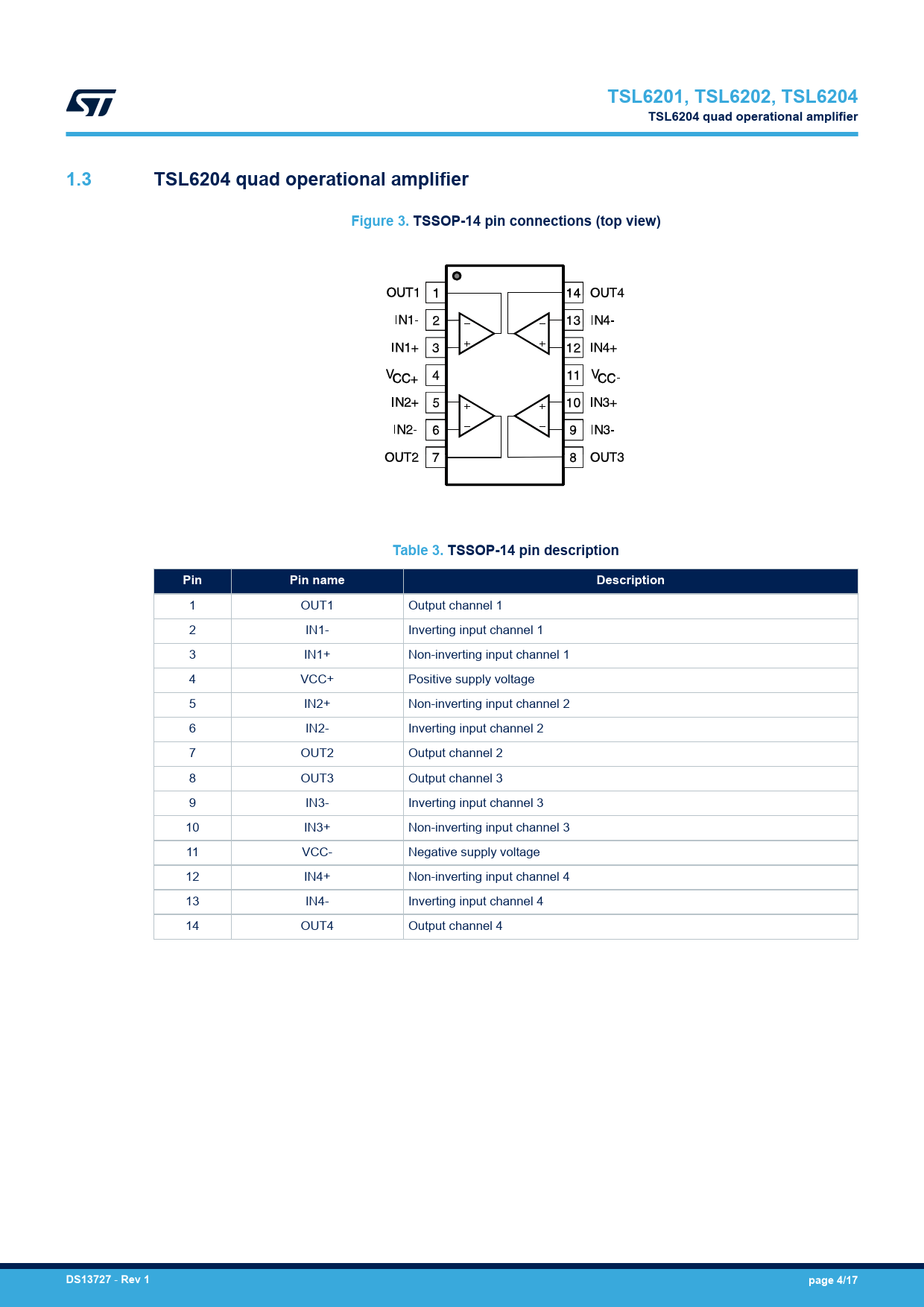 TSL6201, TSL6202, TSL6204. TSL6204 quad operational amplifier. 1.3. Figure 3. TSSOP-14 pin connections (top view)