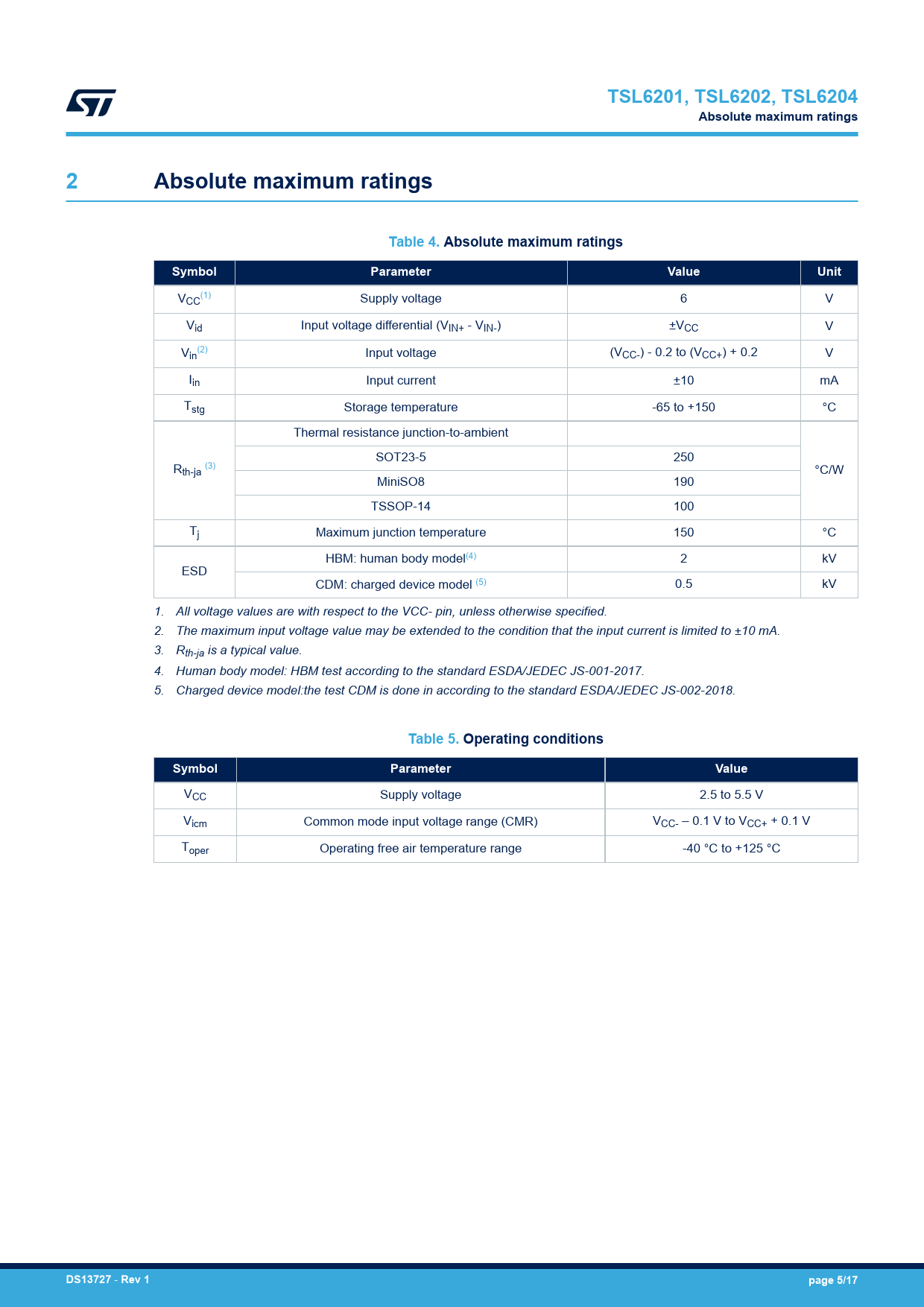 Pages / Page17 / 5 — TSL6201, TSL6202, TSL6204. Absolute maximum ratings. Table 4. Absolute …
