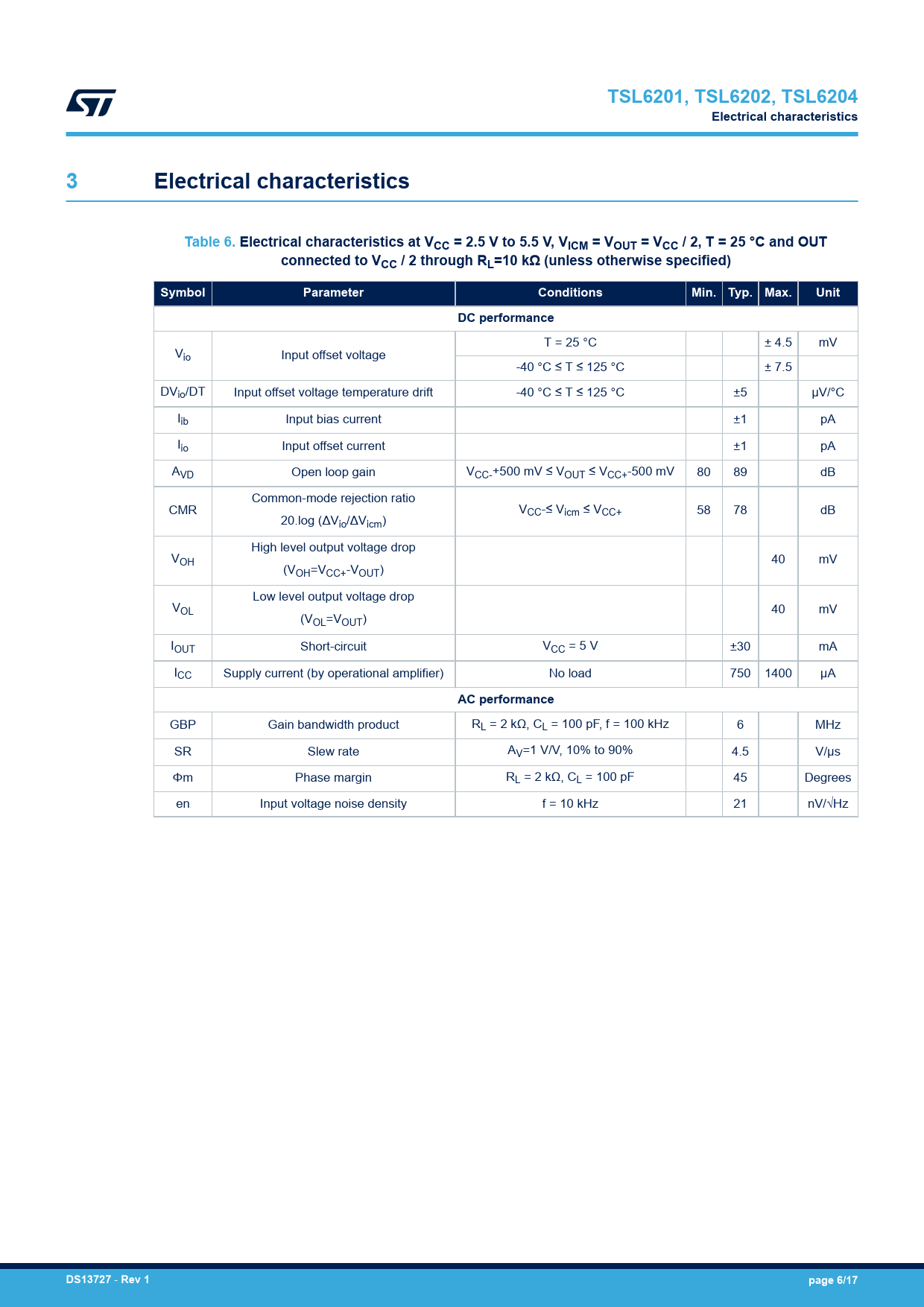 TSL6201, TSL6202, TSL6204 Electrical characteristics 3 Electrical characteristics Table 6. Electrical characteristics at VCC = 2.5 V to 5.5 V, VICM = VOUT = VCC / 2, T = 25 °C and OUT connected to VCC / 2 through RL=10 kΩ (unless otherwise specified) Symbol Parameter Conditions Min. Typ. Max. Unit DC performance