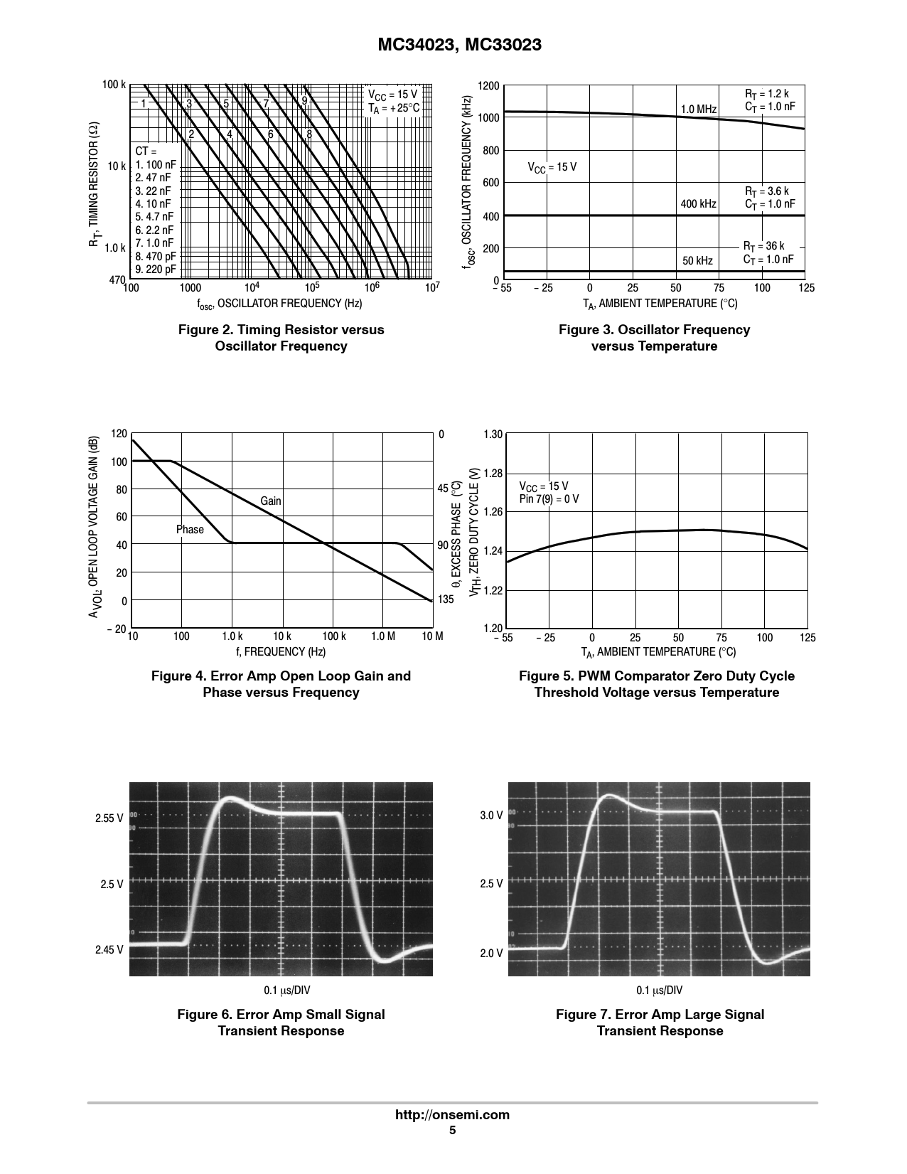 MC34023, MC33023 100 k 1200 V R 9 CC = 15 V T = 1.2 k 1 3 5 7 TA = + 25°C 1.0 MHz CT = 1.0 nF (kHz) 1000 Ω 2 4 6 8 OR ( ) CT = 800 10 k 1. 100 nF VCC = 15 V 2. 47 nF 600 3. 22 nF OR FREQUENCY RT = 3.6 k T 4. 10 nF 400 kHz CT = 1.0 nF 5. 4.7 nF 400 , TIMING RESIST T 6. 2.2 nF R 7. 1.0 nF 1.0 k , OSCILLA R 200 T = 36 k 8. 470 pF 50 kHz C f osc T = 1.0 nF 9. 220 pF 470 0 100 1000 104 105 106 107 -55 -25 0 25 50 75 100 125 fosc, OSCILLATOR FREQUENCY (Hz) TA, AMBIENT TEMPERATURE (°C) Figure 2. Timing Resistor versusFigure 3. Oscillator FrequencyOscillator Frequencyversus Temperature 120 0 1.30 100 1.28 80 45 °C) VCC = 15 V Gain Pin 7(9) = 0 V TAGE GAIN (dB) CYCLE (V) 1.26 60 VOL Phase 40 90 1.24 20 θ , EXCESS PHASE ( , ZERO DUTY , OPEN LOOP V TH 1.22 0 135 VOLA -20 1.20 10 100 1.0 k 10 k 100 k 1.0 M 10 M -55 -25 0 25 50 75 100 125 f, FREQUENCY (Hz) TA, AMBIENT TEMPERATURE (°C) Figure 4. Error Amp Open Loop Gain andFigure 5. PWM Comparator Zero Duty CyclePhase versus FrequencyThreshold Voltage versus Temperature 2.55 V 3.0 V 2.5 V 2.5 V 2.45 V 2.0 V 0.1 ms/DIV 0.1 ms/DIV Figure 6. Error Amp Small SignalFigure 7. Error Amp Large SignalTransient ResponseTransient Responsehttp://onsemi.com5