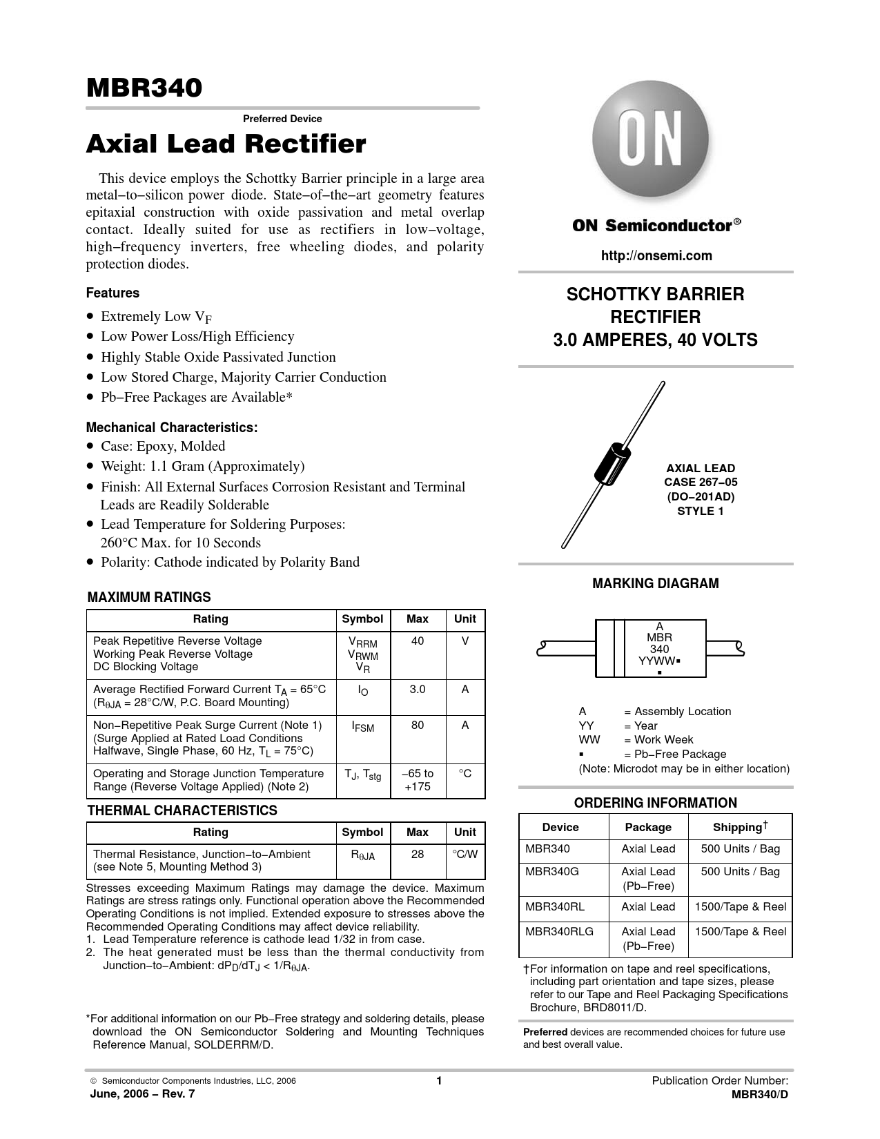 June, 2006 − Rev. 7 MBR340/D