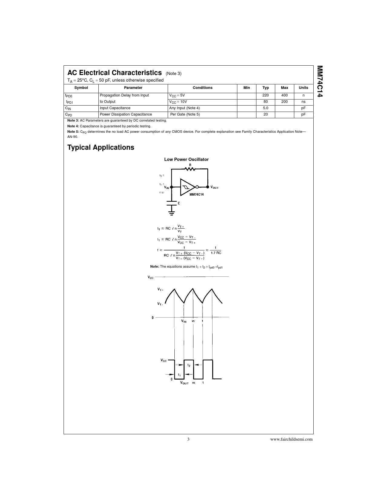 MM74C14. AC Electrical Characteristics. Symbol. Parameter. Conditions. Min. Typ. Max. Units. Note 3:. Note 4:. Note 5:. Typical Applications
