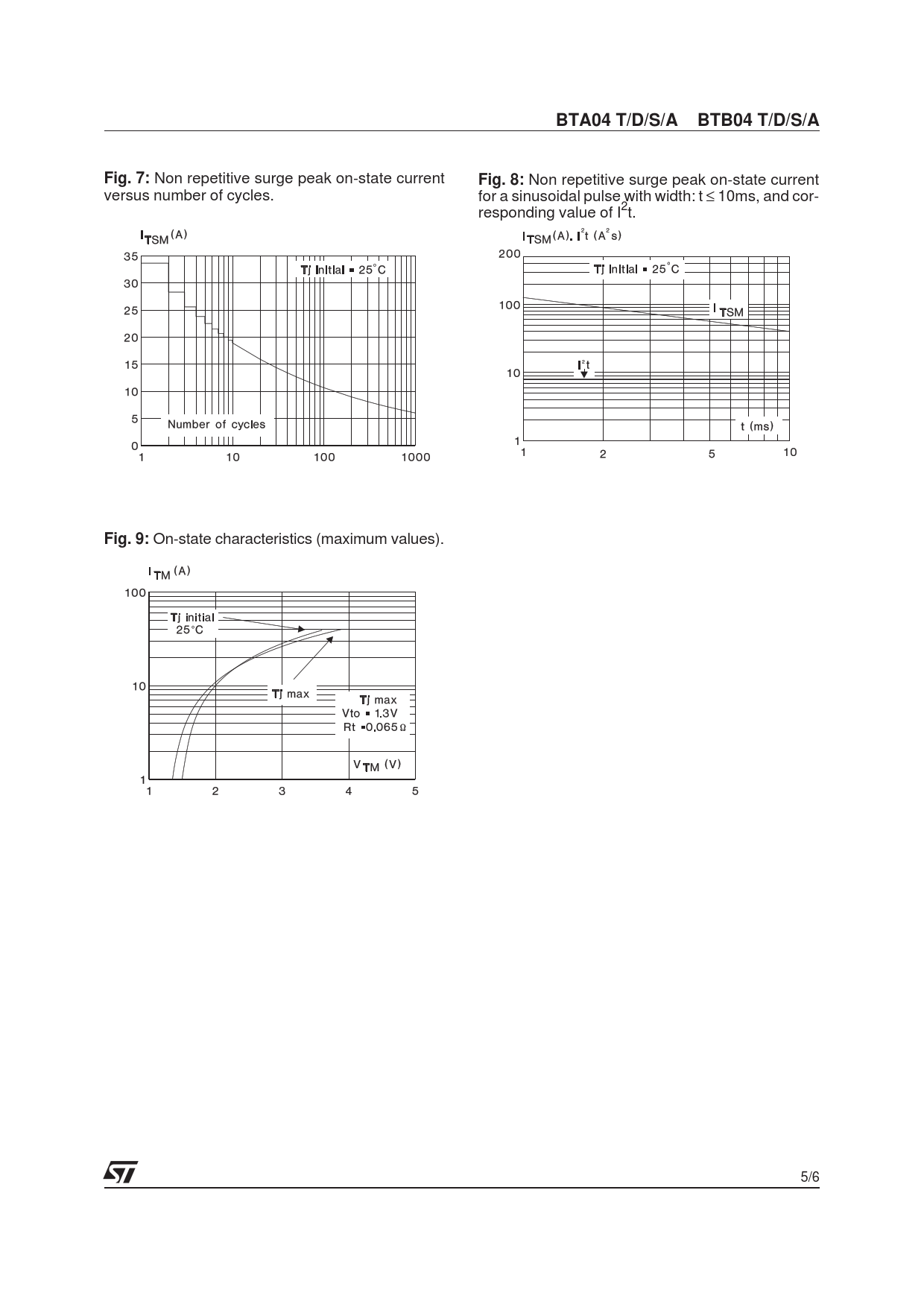 BTA04 T/D/S/A BTB04 T/D/S/AFig. 7: Non repetitive surge peak on-state current Fig. 8: Non repetitive surge peak on-state current versus number of cycles. for a sinusoidal pulse with width: t ≤ 10ms, and cor- responding value of I2t. Fig. 9: On-state characteristics (maximum values). 5/6