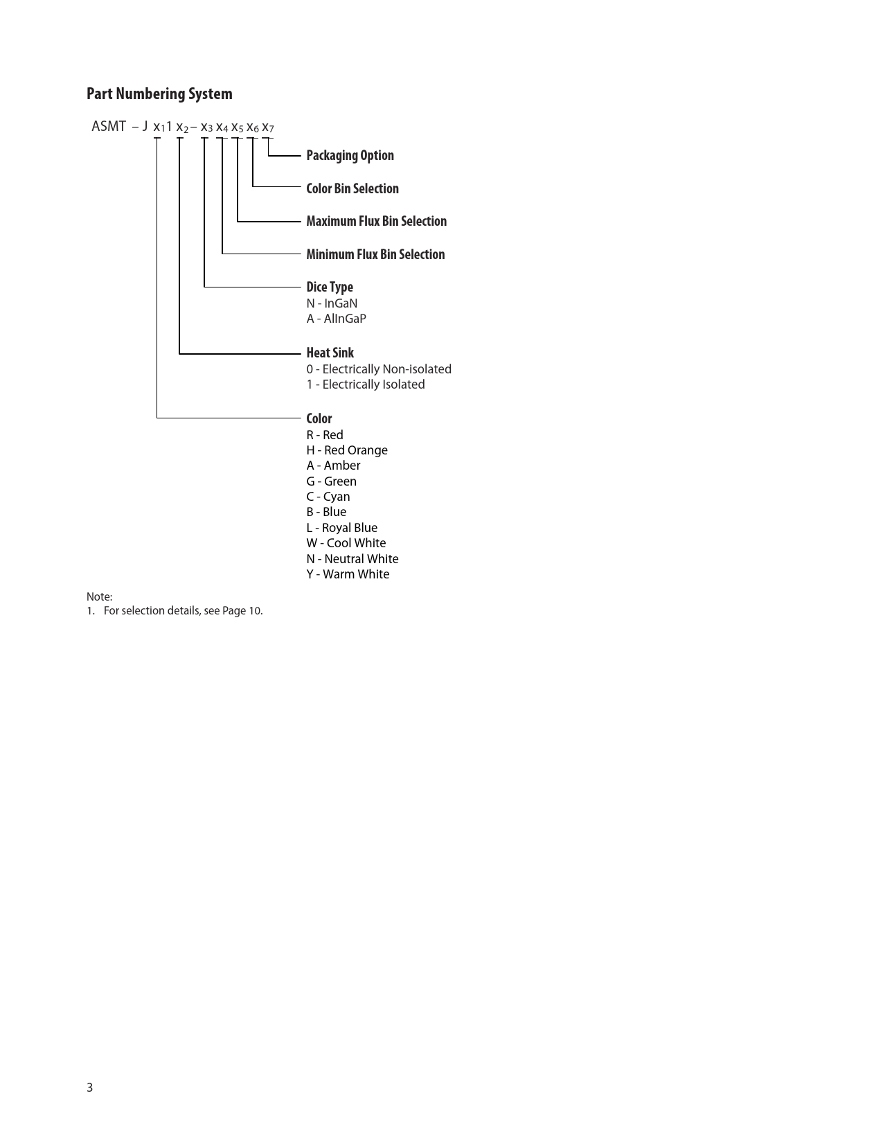 Part Numbering System ASMT – J x 1 1 x2 – x3 x4 x5 x6 x7 Packaging OptionColor Bin SelectionMaximum Flux Bin SelectionMinimum Flux Bin SelectionDice Type N - InGaN A - AlInGaP Heat Sink 0 - Electrically Non-isolated 1 - Electrically Isolated Color R - Red H - Red Orange A - Amber G - Green C - Cyan B - Blue L - Royal Blue W - Cool White N - Neutral White Y - Warm White Note: 1. For selection details, see Page 10. 3