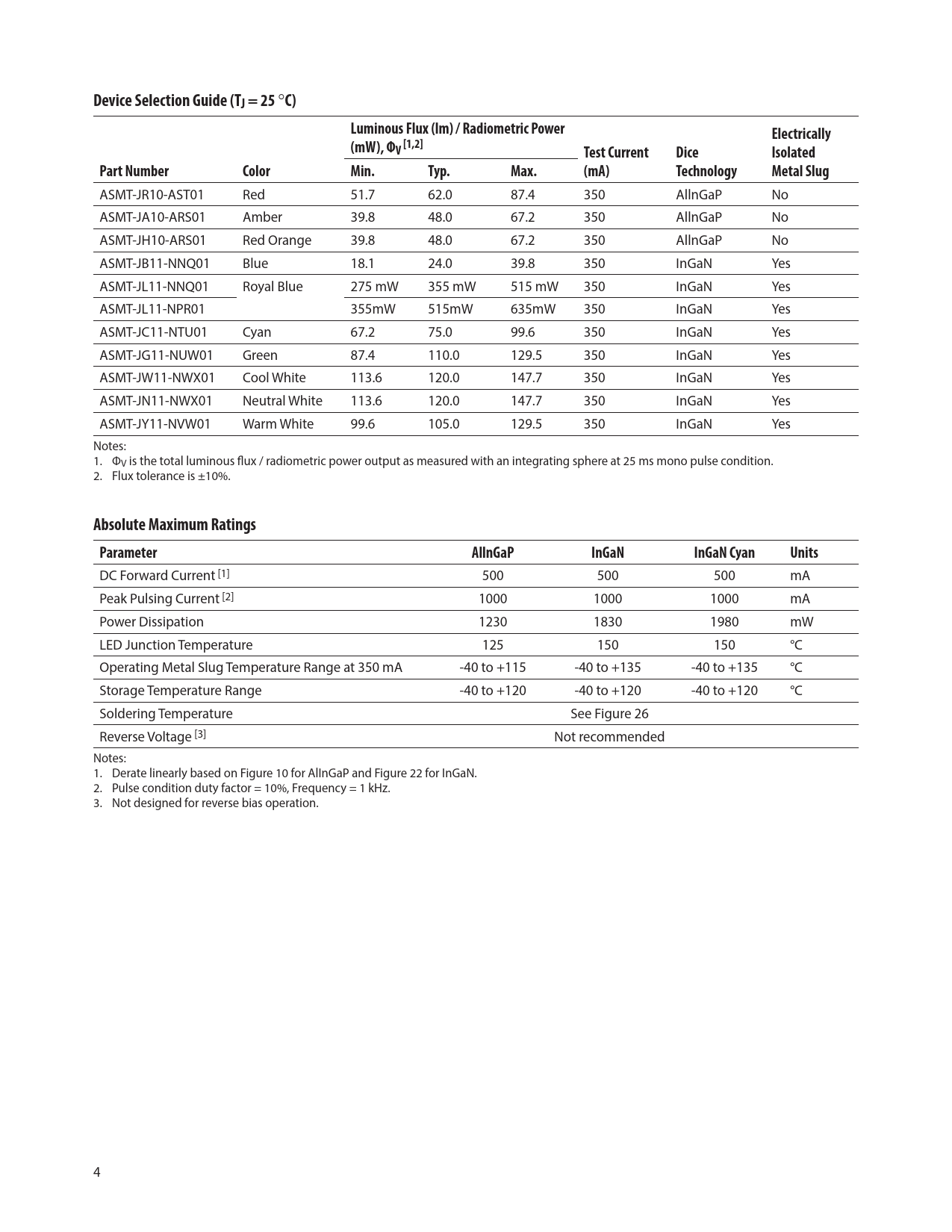 ASMT-JR10-AST01 Red 51.7 62.0 87.4 350 AllnGaP No ASMT-JA10-ARS01 Amber 39.8 48.0 67.2 350 AllnGaP No ASMT-JH10-ARS01 Red Orange 39.8 48.0 67.2 350 AllnGaP No ASMT-JB11-NNQ01 Blue 18.1 24.0 39.8 350 InGaN Yes ASMT-JL11-NNQ01 Royal Blue 275 mW 355 mW 515 mW 350 InGaN Yes ASMT-JL11-NPR01 355mW 515mW 635mW 350 InGaN Yes ASMT-JC11-NTU01 Cyan 67.2 75.0 99.6 350 InGaN Yes ASMT-JG11-NUW01 Green 87.4 110.0 129.5 350 InGaN Yes ASMT-JW11-NWX01 Cool White 113.6 120.0 147.7 350 InGaN Yes ASMT-JN11-NWX01 Neutral White 113.6 120.0 147.7 350 InGaN Yes ASMT-JY11-NVW01 Warm White 99.6 105.0 129.5 350 InGaN Yes Notes: 1. ΦV is the total luminous flux / radiometric power output as measured with an integrating sphere at 25 ms mono pulse condition. 2. Flux tolerance is ±10%.
