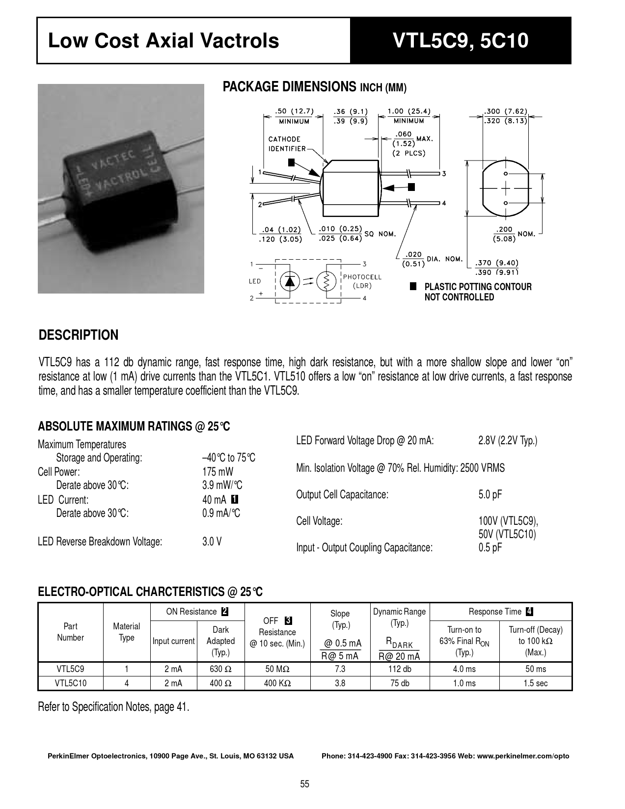 Low Cost Axial Vactrols. VTL5C9, 5C10. PACKAGE DIMENSIONS INCH (MM). PLASTIC POTTING CONTOUR NOT CONTROLLED. DESCRIPTION