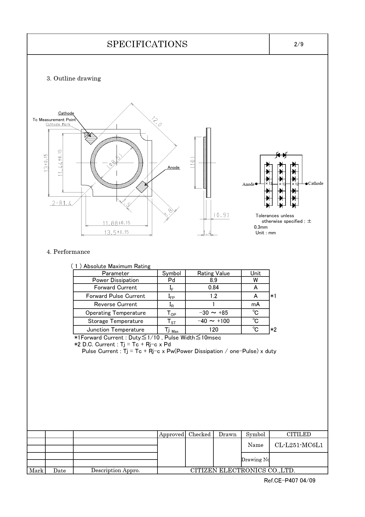 SPECIFICATIONS 2/9 3. Outline drawing Cathode Tc Measurement Point Anode Anode ×12 ×12 ×12 Cathode Tolerances unless otherwise specified : ± 0.3mm Unit : mm 4. Performance ( 1 ) Absolute Maximum Rating Parameter Symbol Rating Value Unit Power Dissipation Pd 8.9 W Forward Current IF 0.84 A Forward Pulse Current IFP 1.2 A *1 Reverse Current IR 1 mA Operating Temperature TOP -30 ~ +85 ℃ Storage Temperature TST -40 ~ +100 ℃ Junction Temperature Tj Max 120 ℃ *2 *1Forward Current : Duty≦1/10 , Pulse Width≦10msec *2 D.C. Current : Tj = Tc + Rj-c x Pd Pulse Current : Tj = Tc + Rj-c x Pw(Power Dissipation / one-Pulse) x duty Approved Checked Drawn Symbol CITILED Name CL-L251-MC6L1 Drawing No Mark Date Description Appro. CITIZEN ELECTRONICS CO.,LTD. Ref.CE-P407 04/09