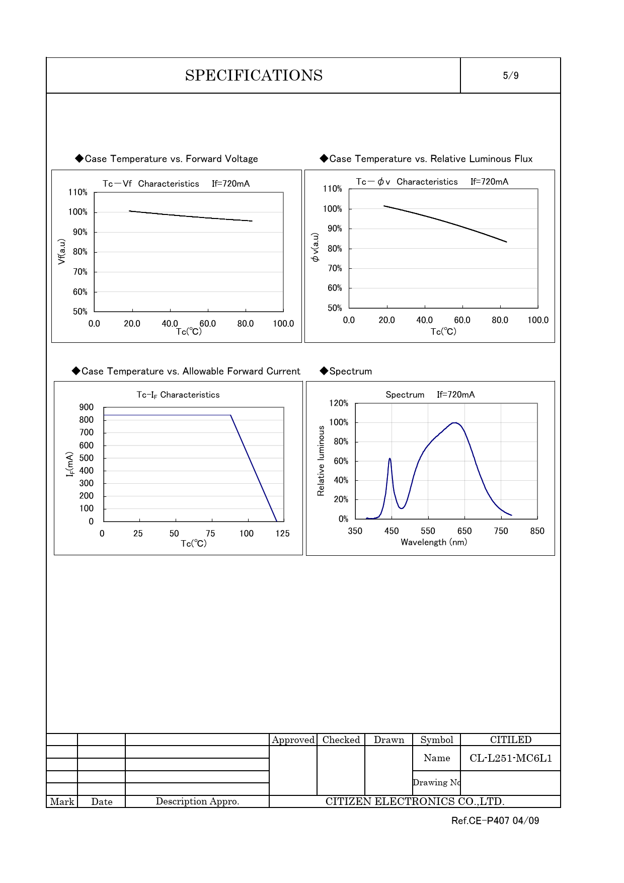 SPECIFICATIONS 5/9 ◆Case Temperature vs. Forward Voltage ◆Case Temperature vs. Relative Luminous Flux Tc-Vf Characteristics If=720mA Tc-φv Characteristics If=720mA 110% 110% 100% 100% 90% 90% ) 80% 80% f(a.u v(a.u V φ 70% 70% 60% 60% 50% 50% 0.0 20.0 40.0 60.0 80.0 100.0 0.0 20.0 40.0 60.0 80.0 100.0 Tc(℃) Tc(℃) ◆Case Temperature vs. Allowable Forward Current ◆Spectrum Tc-IF Characteristics Spectrum If=720mA 900 120% 800 100% s 700 u o 600 80% in ) m A 500 lu 60% (m 400 I F 300 40% lative e 200 R 20% 100 0 0% 0 25 50 75 100 125 350 450 550 650 750 850 Tc(℃) Wavelength (nm) Approved Checked Drawn Symbol CITILED Name CL-L251-MC6L1 Drawing No Mark Date Description Appro. CITIZEN ELECTRONICS CO.,LTD. Ref.CE-P407 04/09