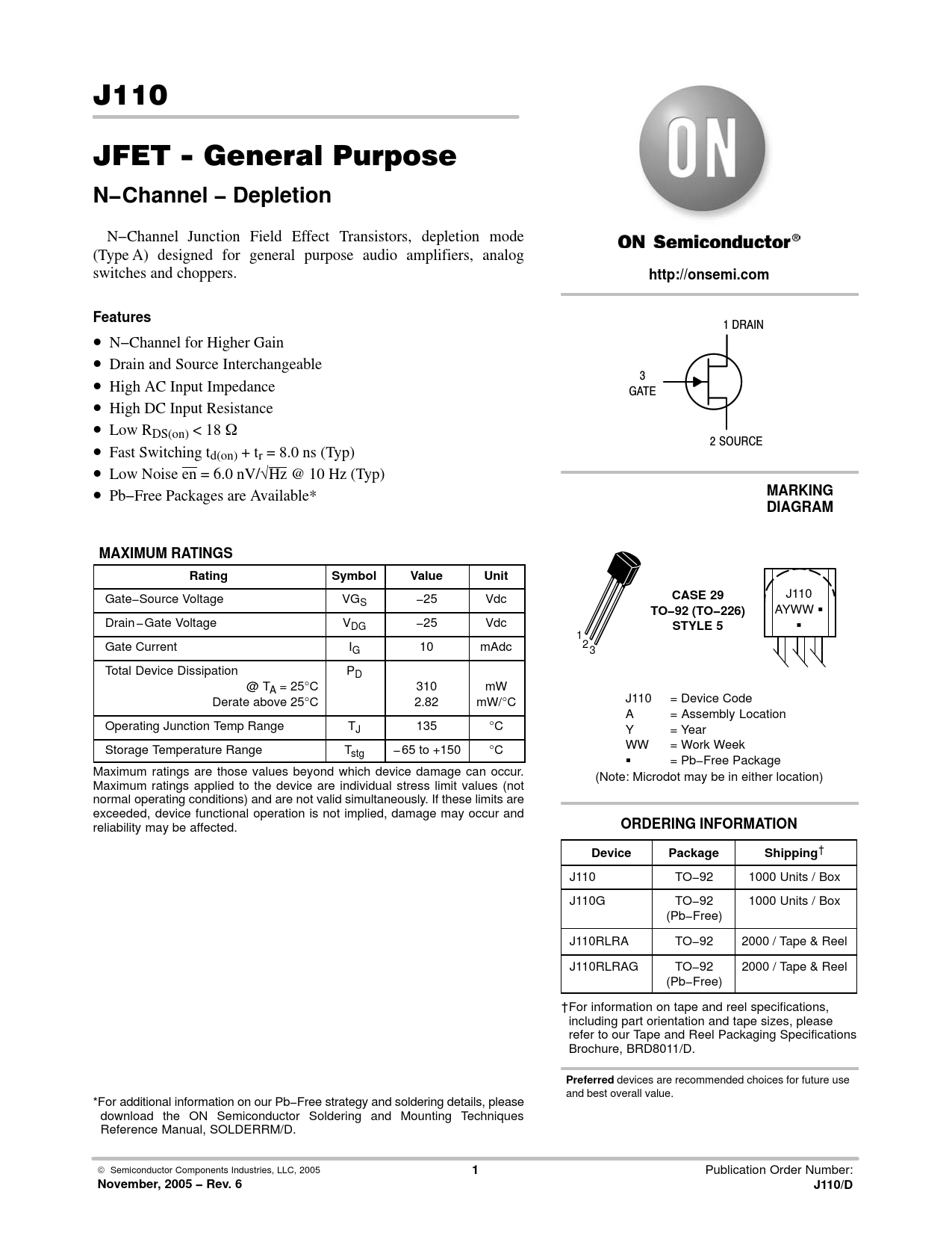 † J110 TO−92 1000 Units / Box J110G TO−92 1000 Units / Box (Pb−Free) J110RLRA TO−92 2000 / Tape & Reel J110RLRAG TO−92 2000 / Tape & Reel (Pb−Free) †For information on tape and reel specifications, including part orientation and tape sizes, please refer to our Tape and Reel Packaging Specifications Brochure, BRD8011/D.
