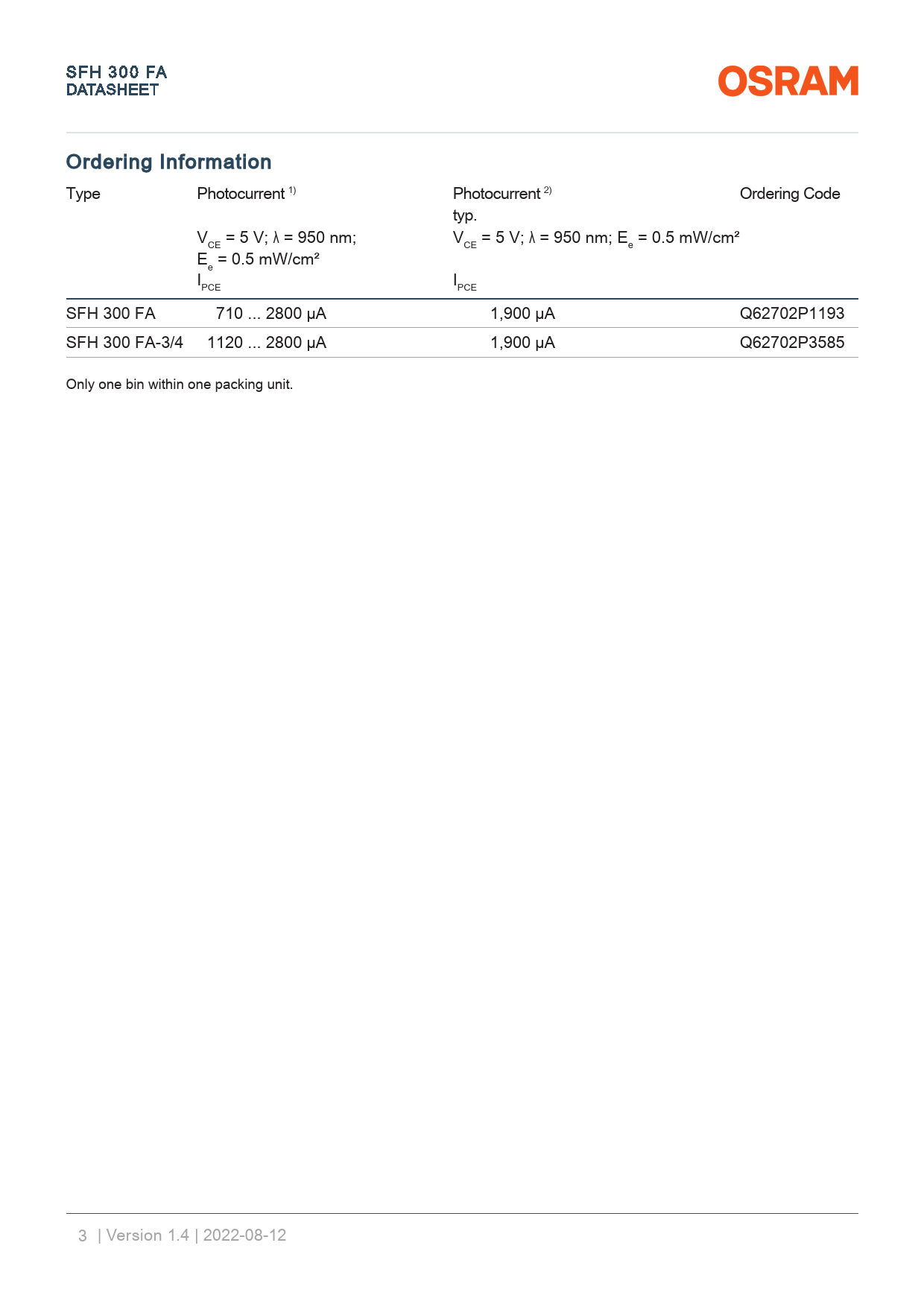 link to page 14 link to page 14 SFH 300 FA DATA A SHEET Ordering Information Type Photocurrent 1) Photocurrent 2) Ordering Code typ. V = 5 V; λ = 950 nm; V = 5 V; λ = 950 nm; E = 0.5 mW/cm² CE CE e E = 0.5 mW/cm² e I I PCE PCE SFH 300 FA 710 ... 2800 µA 1,900 µA Q62702P1193 SFH 300 FA-3/4 1120 ... 2800 µA 1,900 µA Q62702P3585 Only one bin within one packing unit. 3 | Version 1.4 | 2022-08-12