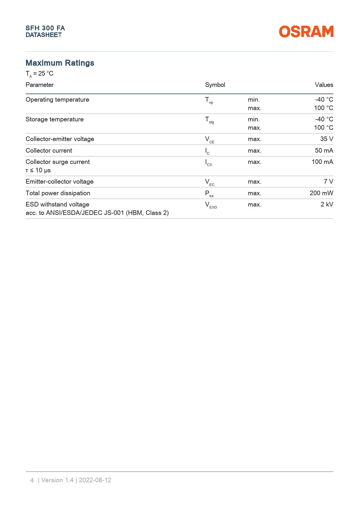 SFH 300 FA DATA A SHEET Maximum Ratings T = 25 °C A Parameter Symbol Values Operating temperature T min. -40 °C op max. 100 °C Storage temperature T min. -40 °C stg max. 100 °C Collector-emitter voltage V max. 35 V CE Collector current I max. 50 mA C Collector surge current I max. 100 mA CS τ ≤ 10 µs Emitter-collector voltage V max. 7 V EC Total power dissipation P max. 200 mW tot ESD withstand voltage V max. 2 kV ESD acc. to ANSI/ESDA/JEDEC JS-001 (HBM, Class 2) 4 | Version 1.4 | 2022-08-12