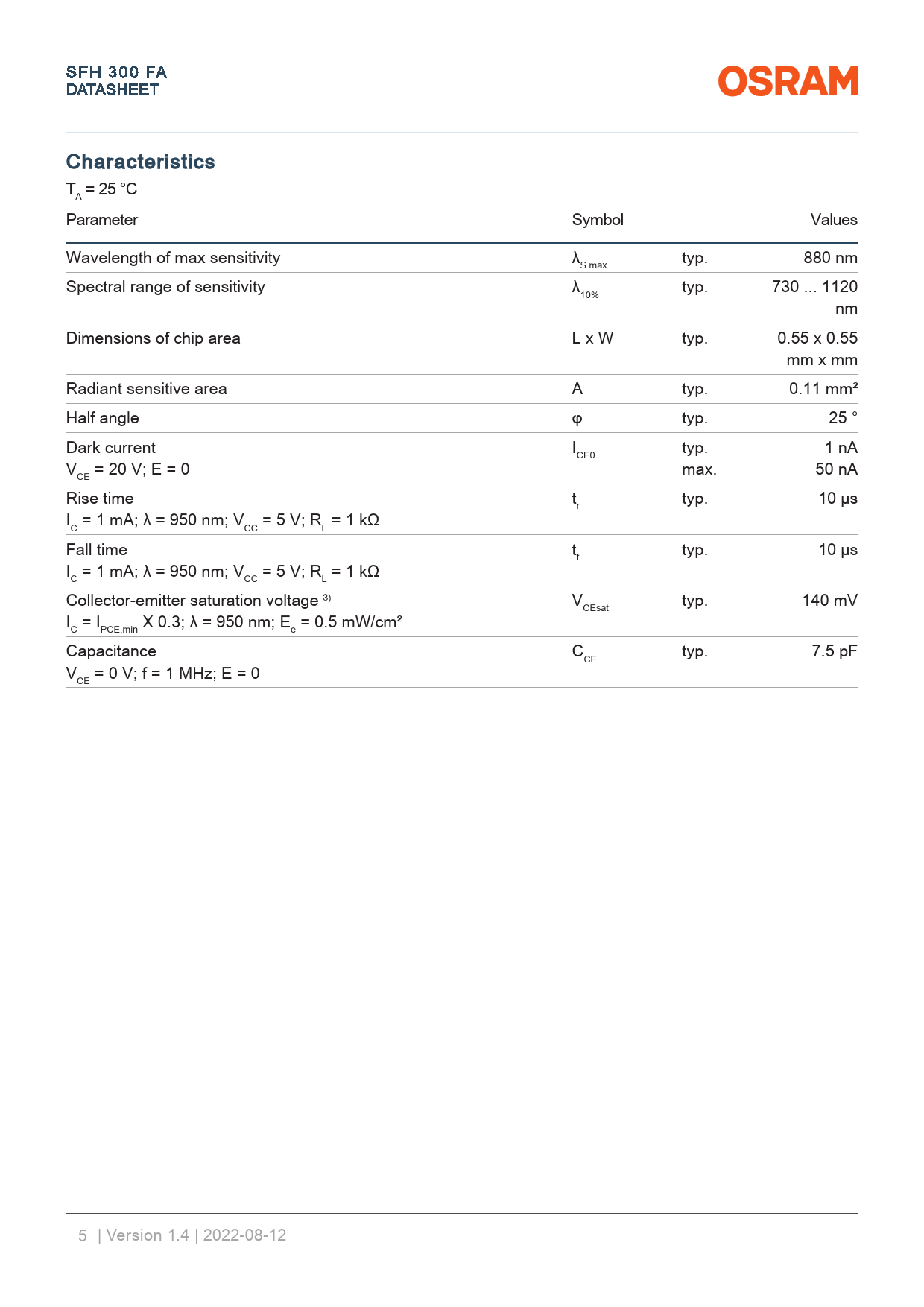 link to page 14 SFH 300 FA DATA A SHEET Characteristics T = 25 °C A Parameter Symbol Values Wavelength of max sensitivity λ typ. 880 nm S max Spectral range of sensitivity λ typ. 730 ... 1120 10% nm Dimensions of chip area L x W typ. 0.55 x 0.55 mm x mm Radiant sensitive area A typ. 0.11 mm² Half angle φ typ. 25 ° Dark current I typ. 1 nA CE0 V = 20 V; E = 0 max. 50 nA CE Rise time t typ. 10 µs r I = 1 mA; λ = 950 nm; V = 5 V; R = 1 kΩ C CC L Fall time t typ. 10 µs f I = 1 mA; λ = 950 nm; V = 5 V; R = 1 kΩ C CC L Collector-emitter saturation voltage 3) V typ. 140 mV CEsat I = I X 0.3; λ = 950 nm; E = 0.5 mW/cm² C PCE,min e Capacitance C typ. 7.5 pF CE V = 0 V; f = 1 MHz; E = 0 CE 5 | Version 1.4 | 2022-08-12