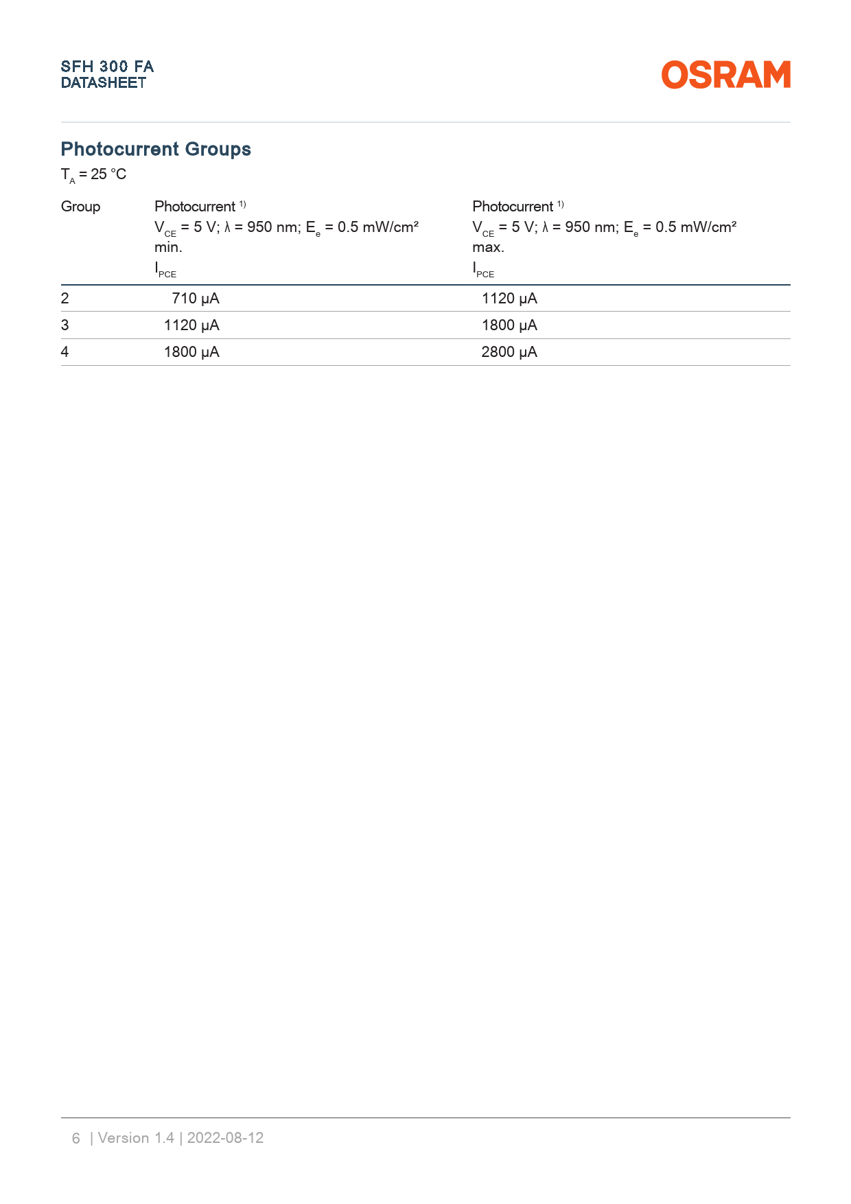 link. to. page. 14. link. to. page. 14. SFH. 300. FA. DATA. A. SHEET. Photocurrent. Groups. T. =. 25. °C. A. Group. Photocurrent. 1). Photocurrent. 1). V. =. 5. V;. λ. =. 950. nm;. E. =. 0.5
