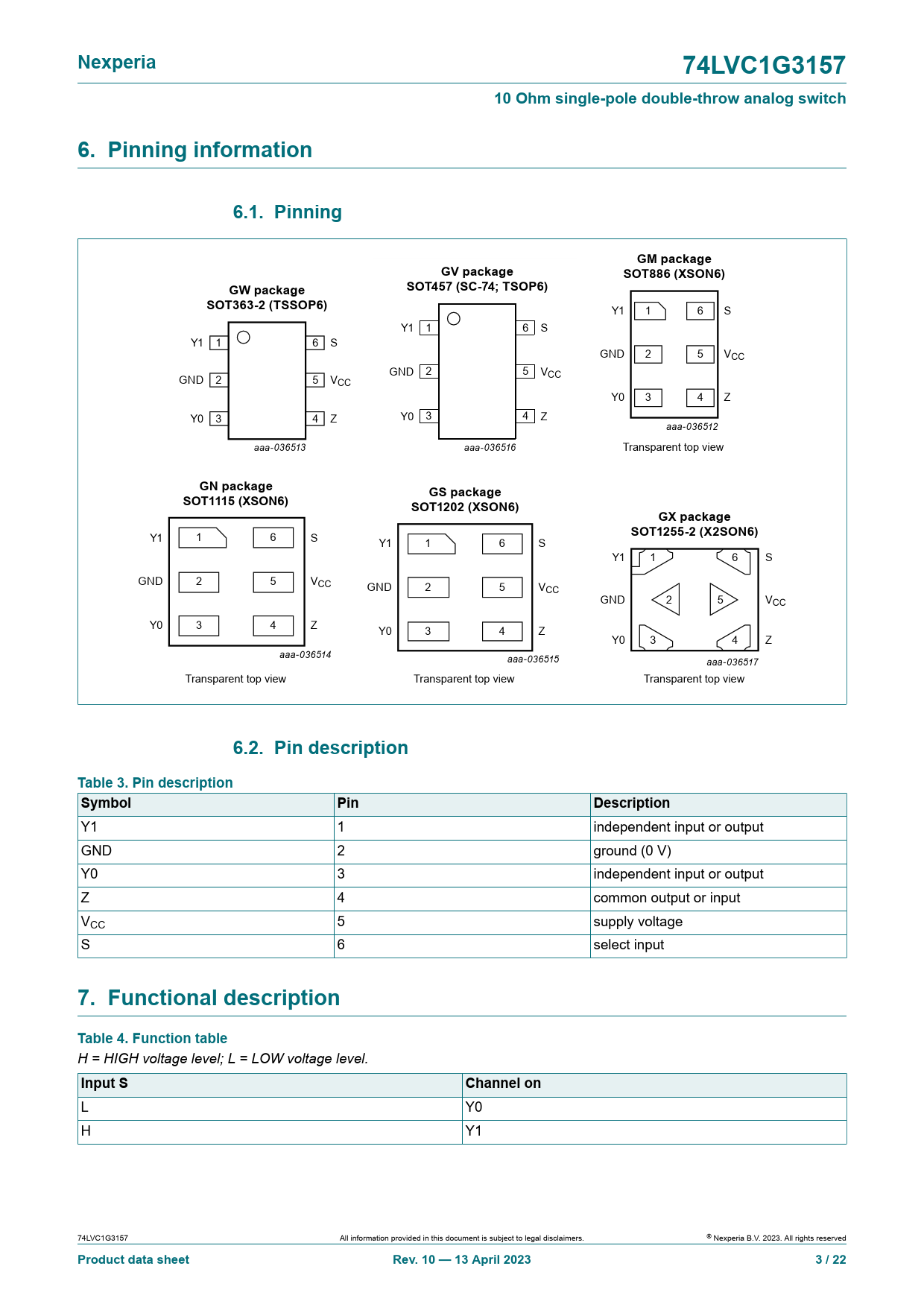 Nexperia. 74LVC1G3157. 10 Ohm single-pole double-throw analog switch. 6. Pinning information. 6.1. Pinning. GM package. GV package