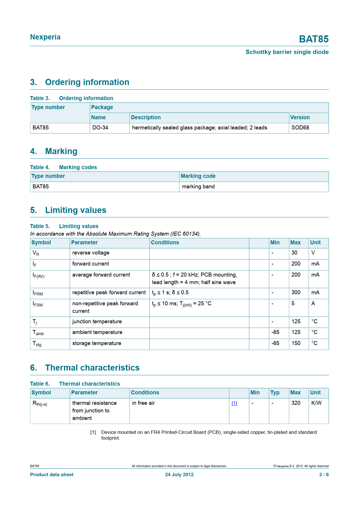 | Pages / Page | 8 / 2 — Nexperia. BAT85. Schottky barrier single diode. 3. Ordering information. … |