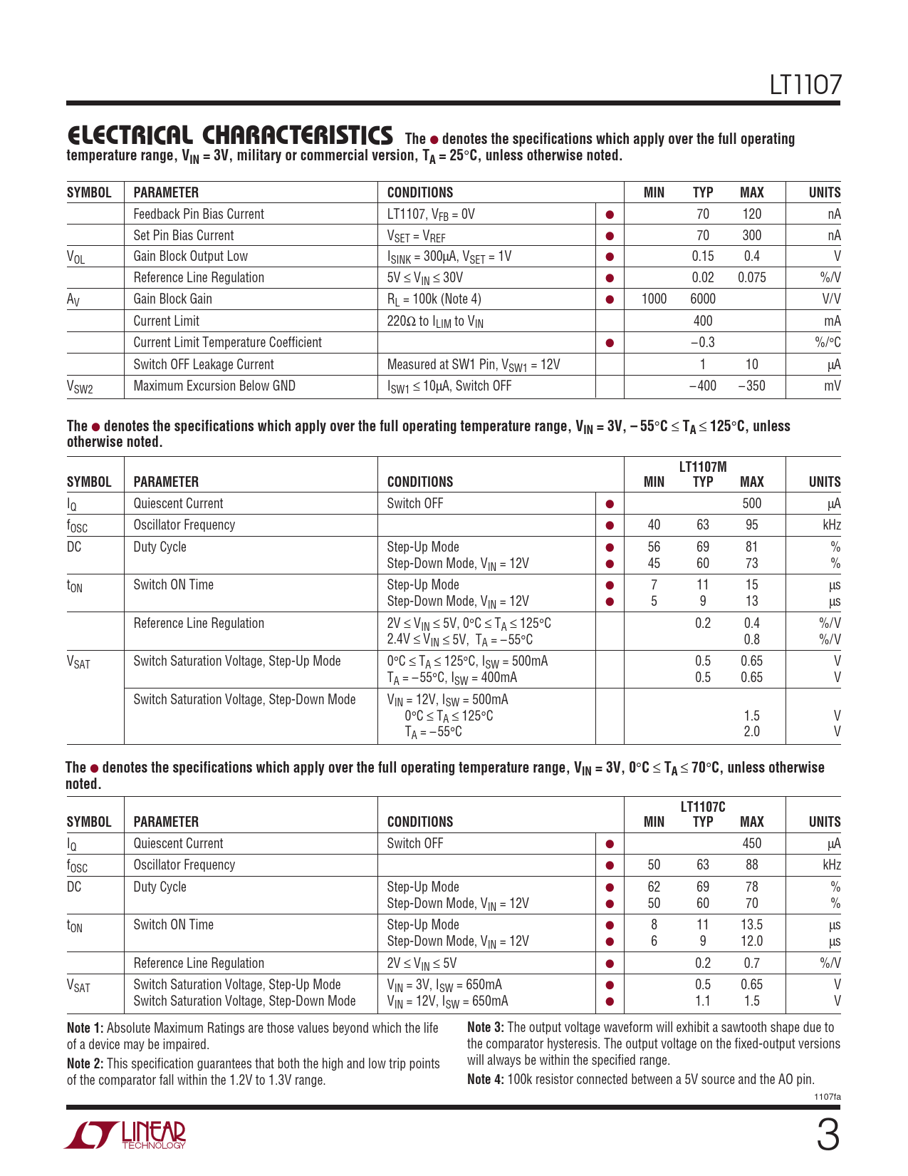 LT1107 ELECTRICAL CHCARA TERISTICS The ● denotes the specifications which apply over the full operatingtemperature range, VIN = 3V, military or commercial version, TA = 25 ° C, unless otherwise noted.SYMBOLPARAMETERCONDITIONSMINTYPMAXUNITS Feedback Pin Bias Current LT1107, VFB = 0V ● 70 120 nA Set Pin Bias Current VSET = VREF ● 70 300 nA VOL Gain Block Output Low ISINK = 300µA, VSET = 1V ● 0.15 0.4 V Reference Line Regulation 5V ≤ VIN ≤ 30V ● 0.02 0.075 %/V AV Gain Block Gain RL = 100k (Note 4) ● 1000 6000 V/V Current Limit 220Ω to ILIM to VIN 400 mA Current Limit Temperature Coefficient ● – 0.3 %/°C Switch OFF Leakage Current Measured at SW1 Pin, VSW1 = 12V 1 10 µA VSW2 Maximum Excursion Below GND ISW1 ≤ 10µA, Switch OFF – 400 – 350 mV The ● denotes the specifications which apply over the full operating temperature range, VIN = 3V, – 55 ° C ≤ TA ≤ 125 ° C, unlessotherwise noted.LT1107MSYMBOLPARAMETERCONDITIONSMINTYPMAXUNITS IQ Quiescent Current Switch OFF ● 500 µA fOSC Oscillator Frequency ● 40 63 95 kHz DC Duty Cycle Step-Up Mode ● 56 69 81 % Step-Down Mode, VIN = 12V ● 45 60 73 % tON Switch ON Time Step-Up Mode ● 7 11 15 µs Step-Down Mode, VIN = 12V ● 5 9 13 µs Reference Line Regulation 2V ≤ VIN ≤ 5V, 0°C ≤ TA ≤ 125°C 0.2 0.4 %/V 2.4V ≤ VIN ≤ 5V, TA = – 55°C 0.8 %/V VSAT Switch Saturation Voltage, Step-Up Mode 0°C ≤ TA ≤ 125°C, ISW = 500mA 0.5 0.65 V TA = – 55°C, ISW = 400mA 0.5 0.65 V Switch Saturation Voltage, Step-Down Mode VIN = 12V, ISW = 500mA 0°C ≤ TA ≤ 125°C 1.5 V TA = – 55°C 2.0 V The ● denotes the specifications which apply over the full operating temperature range, VIN = 3V, 0 ° C ≤ TA ≤ 70 ° C, unless otherwisenoted.LT1107CSYMBOLPARAMETERCONDITIONSMINTYPMAXUNITS IQ Quiescent Current Switch OFF ● 450 µA fOSC Oscillator Frequency ● 50 63 88 kHz DC Duty Cycle Step-Up Mode ● 62 69 78 % Step-Down Mode, VIN = 12V ● 50 60 70 % tON Switch ON Time Step-Up Mode ● 8 11 13.5 µs Step-Down Mode, VIN = 12V ● 6 9 12.0 µs Reference Line Regulation 2V ≤ VIN ≤ 5V ● 0.2 0.7 %/V VSAT Switch Saturation Voltage, Step-Up Mode VIN = 3V, ISW = 650mA ● 0.5 0.65 V Switch Saturation Voltage, Step-Down Mode VIN = 12V, ISW = 650mA ● 1.1 1.5 V Note 1: Absolute Maximum Ratings are those values beyond which the life Note 3: The output voltage waveform will exhibit a sawtooth shape due to of a device may be impaired. the comparator hysteresis. The output voltage on the fixed-output versions Note 2: This specification guarantees that both the high and low trip points will always be within the specified range. of the comparator fall within the 1.2V to 1.3V range. Note 4: 100k resistor connected between a 5V source and the AO pin. 1107fa 3