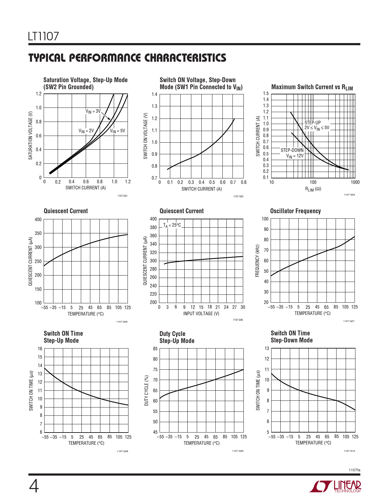16 85 13 15 80 12 14 75 11 µs) 13 µs) 70 10 12 11 65 9 10 60 8 DUTY CYCLE (%) SWITCH ON TIME ( 9 SWITCH ON TIME ( 55 7 8 50 6 7 6 45 5 –55 –35 –15 5 25 45 65 85 105 125 –55 –35 –15 5 25 45 65 85 105 125 –55 –35 –15 5 25 45 65 85 105 125 TEMPERATURE (°C) TEMPERATURE (°C) TEMPERATURE (°C) 1107 G08 1107 G09 1107 G10 1107fa 4