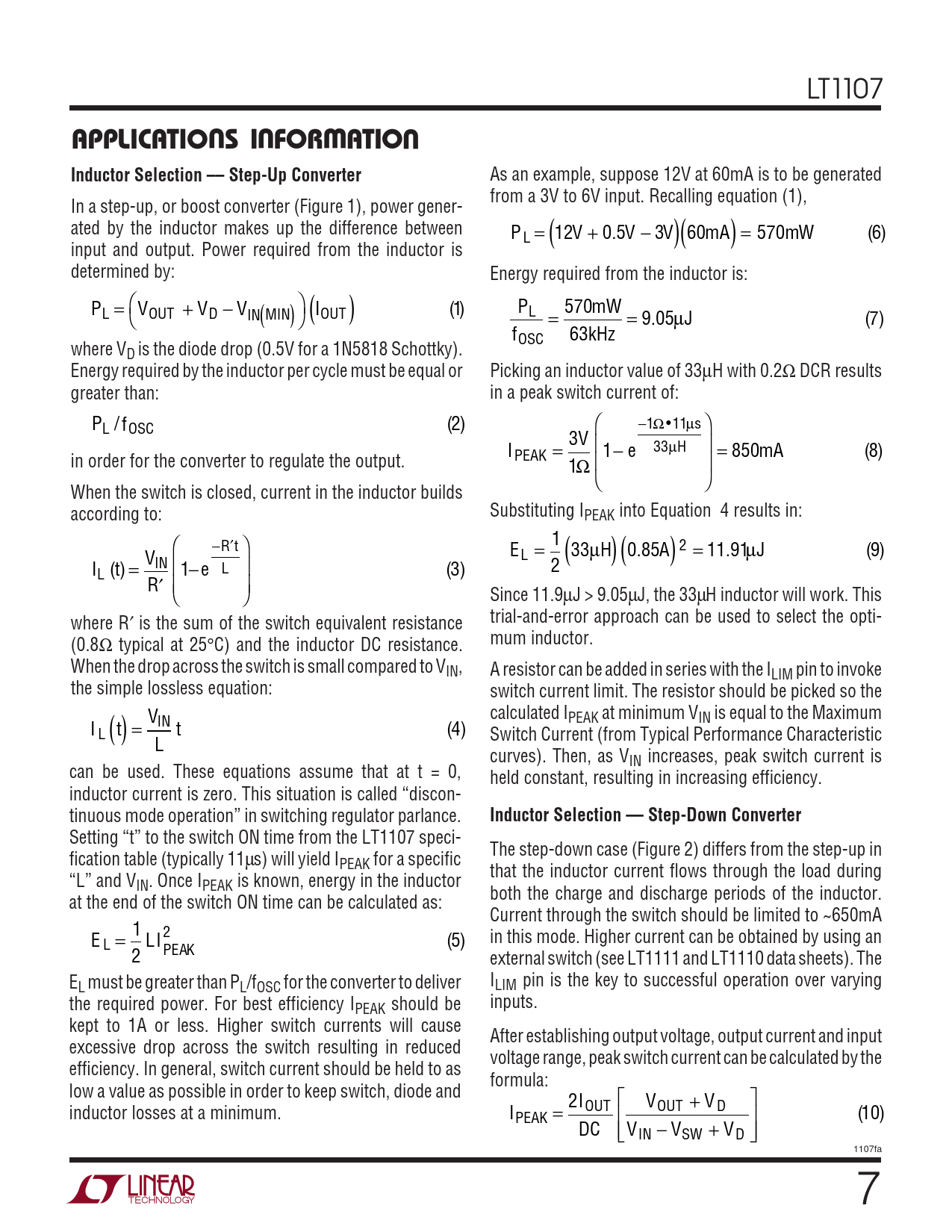 LT1107 OUUWUAPPLICATIS I FOR ATIOInductor Selection –– Step-Up Converter As an example, suppose 12V at 60mA is to be generated from a 3V to 6V input. Recalling equation (1), In a step-up, or boost converter (Figure 1), power gener- ated by the inductor makes up the difference between P V 12 0. V 5 V 3 6 m 0 A = m 570 W ( )( ) L = + − 6 ( ) input and output. Power required from the inductor is determined by: Energy required from the inductor is: P = V + V − V I ( ) 1 P mW L OUT D L IN MIN OUT ( ) ( ) = 570 = 9 0 . 5 J µ 7 ( ) f kHz OSC 63 where VD is the diode drop (0.5V for a 1N5818 Schottky). Energy required by the inductor per cycle must be equal or Picking an inductor value of 33µH with 0.2Ω DCR results greater than: in a peak switch current of: P −1Ω•11µ L / f OSC ( ) 2 s V 3 I 1 e 33 H = − µ m 850 A 8 ( ) in order for the converter to regulate the output. PEAK 1Ω = When the switch is closed, current in the inductor builds according to: Substituting IPEAK into Equation 4 results in: − 1 R′t 2 µ . µ V E 33 H 0 8 A 5 11 91 J L = ( )( ) = 9 ( ) I t IN ( ) = − 1 e 2 L L ( ) 3 R′ Since 11.9µJ > 9.05µJ, the 33µH inductor will work. This where R′ is the sum of the switch equivalent resistance trial-and-error approach can be used to select the opti- (0.8Ω typical at 25°C) and the inductor DC resistance. mum inductor. When the drop across the switch is small compared to VIN, A resistor can be added in series with the ILIM pin to invoke the simple lossless equation: switch current limit. The resistor should be picked so the calculated I V PEAK at minimum VIN is equal to the Maximum I t IN = t ( ) L ( ) 4 Switch Current (from Typical Performance Characteristic L curves). Then, as VIN increases, peak switch current is can be used. These equations assume that at t = 0, held constant, resulting in increasing efficiency. inductor current is zero. This situation is called “discon- tinuous mode operation” in switching regulator parlance. Inductor Selection –– Step-Down Converter Setting “t” to the switch ON time from the LT1107 speci- The step-down case (Figure 2) differs from the step-up in fication table (typically 11µs) will yield IPEAK for a specific that the inductor current flows through the load during “L” and VIN. Once IPEAK is known, energy in the inductor both the charge and discharge periods of the inductor. at the end of the switch ON time can be calculated as: Current through the switch should be limited to ~650mA 2 in this mode. Higher current can be obtained by using an E = 1 LI L 5 ( ) PEAK 2 external switch (see LT1111 and LT1110 data sheets). The E I L must be greater than PL/fOSC for the converter to deliver LIM pin is the key to successful operation over varying the required power. For best efficiency I inputs. PEAK should be kept to 1A or less. Higher switch currents will cause After establishing output voltage, output current and input excessive drop across the switch resulting in reduced voltage range, peak switch current can be calculated by the efficiency. In general, switch current should be held to as formula: low a value as possible in order to keep switch, diode and 2I V + V inductor losses at a minimum. I OUT OUT D PEAK = 10 ( ) DC V − V + V IN SW D 1107fa 7