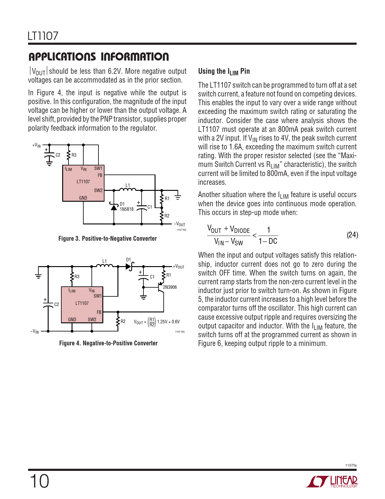 LT1107 OUUWUAPPLICATIS I FOR ATIO VOUTshould be less than 6.2V. More negative output Using the ILIM Pin voltages can be accommodated as in the prior section. The LT1107 switch can be programmed to turn off at a set In Figure 4, the input is negative while the output is switch current, a feature not found on competing devices. positive. In this configuration, the magnitude of the input This enables the input to vary over a wide range without voltage can be higher or lower than the output voltage. A exceeding the maximum switch rating or saturating the level shift, provided by the PNP transistor, supplies proper inductor. Consider the case where analysis shows the polarity feedback information to the regulator. LT1107 must operate at an 800mA peak switch current with a 2V input. If VIN rises to 4V, the peak switch current +VIN will rise to 1.6A, exceeding the maximum switch current + C2 R3 rating. With the proper resistor selected (see the “Maxi- mum Switch Current vs RLIM” characteristic), the switch ILIM VIN SW1 FB current will be limited to 800mA, even if the input voltage LT1107 increases. L1 SW2 Another situation where the I GND LIM feature is useful occurs R1 + D1 when the device goes into continuous mode operation. C1 1N5818 This occurs in step-up mode when: R2 –VOUT 1107 F03 V + V OUT DIODE < 1 24 ( ) Figure 3. Positive-to-Negative Converter V − V 1− DC I N SW When the input and output voltages satisfy this relation- D1 L1 +V ship, inductor current does not go to zero during the OUT + R1 switch OFF time. When the switch turns on again, the R3 C1 current ramp starts from the non-zero current level in the 2N3906 ILIM VIN inductor just prior to switch turn-on. As shown in Figure SW1 + 5, the inductor current increases to a high level before the LT1107 C2 comparator turns off the oscillator. This high current can FB cause excessive output ripple and requires oversizing the GND SW2 R2 R1 VOUT = 1.25V + 0.6V (R2) output capacitor and inductor. With the ILIM feature, the –V 1107 F04 IN switch turns off at the programmed current as shown in Figure 4. Negative-to-Positive Converter Figure 6, keeping output ripple to a minimum. 1107fa 10