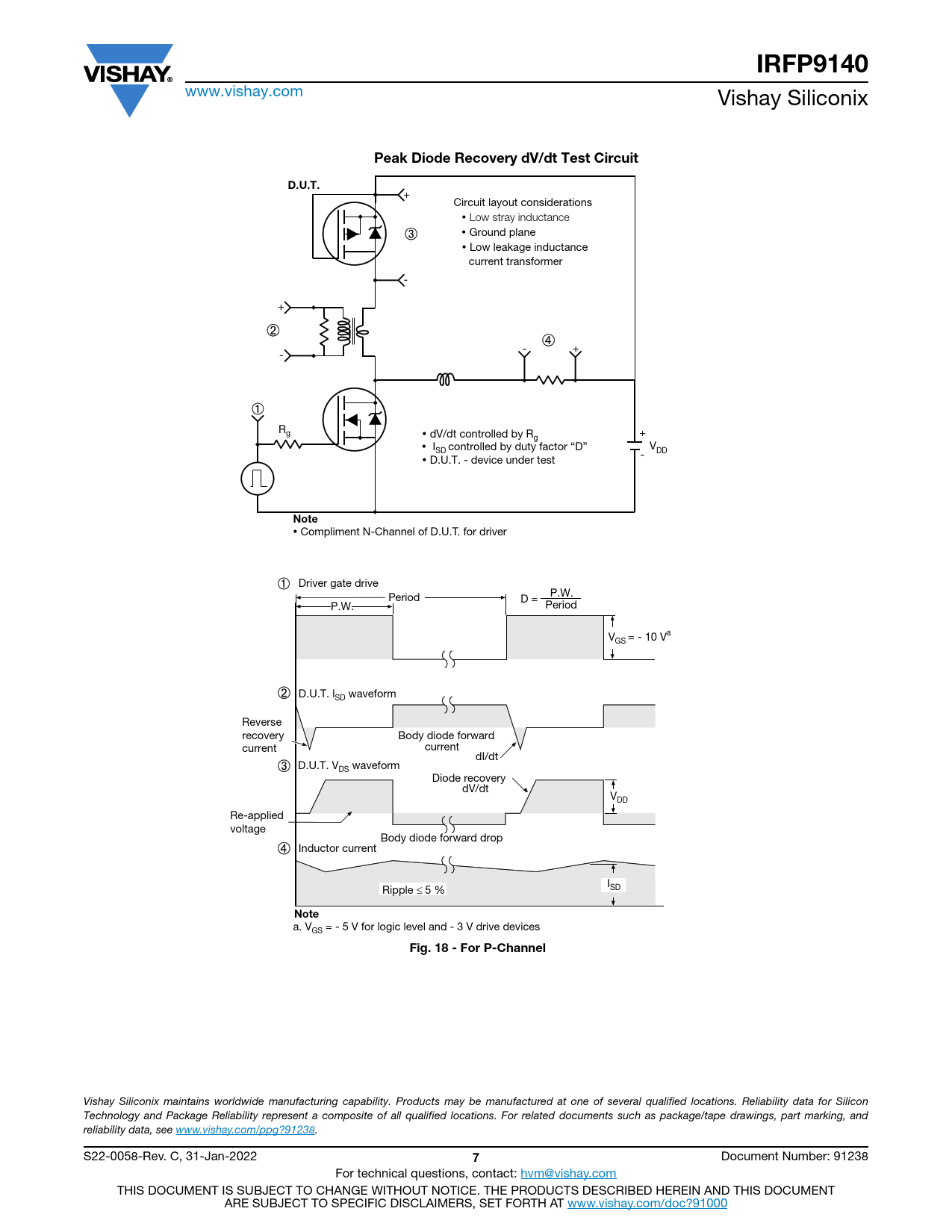 IRFP9140 www.vishay.com Vishay Siliconix Peak Diode Recovery dV/dt Test CircuitD.U.T. + Circuit layout considerations • Low stray inductance • Ground plane • Low leakage inductance current transformer - + - - + Rg • dV/dt controlled by R + g • I V SD controlled by duty factor “D” - DD • D.U.T. - device under test Note • Compliment N-Channel of D.U.T. for driver Driver gate drive Period P.W. D = P.W. Period V = - 10 Va GS D.U.T. l waveform SD Reverse recovery Body diode forward current current dI/dt D.U.T. V waveform DS Diode recovery dV/dt VDD Re-applied voltage Body diode forward drop Inductor current I Ripple ≤ 5 % SD Note a. V = - 5 V for logic level and - 3 V drive devices GS Fig. 18 - For P-Channel Vishay Siliconix maintains worldwide manufacturing capability. Products may be manufactured at one of several qualified locations. Reliability data for Silicon Technology and Package Reliability represent a composite of all qualified locations. For related documents such as package/tape drawings, part marking, and reliability data, see www.vishay.com/ppg?91238. S22-0058-Rev. C, 31-Jan-2022 7 Document Number: 91238 For technical questions, contact: hvm@vishay.com THIS DOCUMENT IS SUBJECT TO CHANGE WITHOUT NOTICE. THE PRODUCTS DESCRIBED HEREIN AND THIS DOCUMENT ARE SUBJECT TO SPECIFIC DISCLAIMERS, SET FORTH AT www.vishay.com/doc?91000