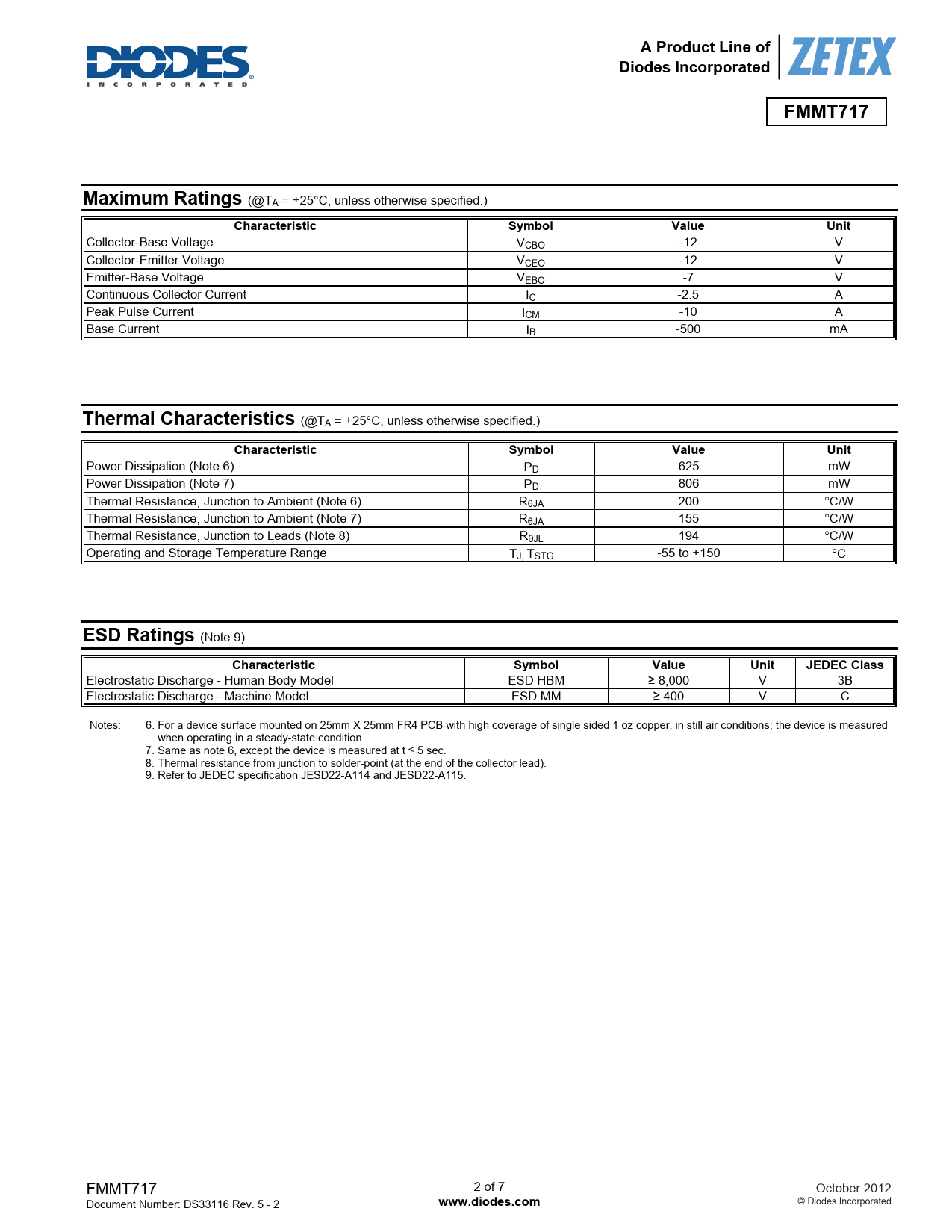 Electrostatic Discharge - Human Body Model ESD HBM ≥ 8,000 V 3B Electrostatic Discharge - Machine Model ESD MM ≥ 400 V C Notes: 6. For a device surface mounted on 25mm X 25mm FR4 PCB with high coverage of single sided 1 oz copper, in still air conditions; the device is measured when operating in a steady-state condition. 7. Same as note 6, except the device is measured at t ≤ 5 sec. 8. Thermal resistance from junction to solder-point (at the end of the collector lead). 9. Refer to JEDEC specification JESD22-A114 and JESD22-A115. FMMT717 2 of 7 October 2012 Document Number: DS33116 Rev. 5 - 2