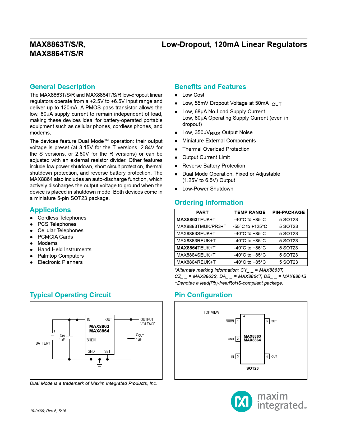 MAX8863T/S/R,Low-Dropout, 120mA Linear RegulatorsMAX8864T/S/RGeneral DescriptionBenefits and Features The MAX8863T/S/R and MAX8864T/S/R low-dropout linear ● Low Cost regulators operate from a +2.5V to +6.5V input range and ● Low, 55mV Dropout Voltage at 50mA I deliver up to 120mA. A PMOS pass transistor allows the OUT low, 80μA supply current to remain independent of load, ● Low, 68μA No-Load Supply Current making these devices ideal for battery-operated portable Low, 80μA Operating Supply Current (even in equipment such as cellular phones, cordless phones, and dropout) modems. ● Low, 350μVRMS Output Noise The devices feature Dual Mode™ operation: their output ● Miniature External Components voltage is preset (at 3.15V for the T versions, 2.84V for ● Thermal Overload Protection the S versions, or 2.80V for the R versions) or can be adjusted with an external resistor divider. Other features ● Output Current Limit include low-power shutdown, short-circuit protection, thermal ● Reverse Battery Protection shutdown protection, and reverse battery protection. The ● Dual Mode Operation: Fixed or Adjustable MAX8864 also includes an auto-discharge function, which (1.25V to 6.5V) Output actively discharges the output voltage to ground when the device is placed in shutdown mode. Both devices come in ● Low-Power Shutdown a miniature 5-pin SOT23 package. Ordering InformationApplicationsPARTTEMP RANGEPIN-PACKAGE ● Cordless Telephones MAX8863 TEUK+T -40°C to +85°C 5 SOT23 ● PCS Telephones MAX8863TMUK/PR3+T -55°C to +125°C 5 SOT23 ● Cellular Telephones ● PCMCIA Cards MAX8863SEUK+T -40°C to +85°C 5 SOT23 ● Modems MAX8863REUK+T -40°C to +85°C 5 SOT23 ● Hand-Held Instruments MAX8864 TEUK+T -40°C to +85°C 5 SOT23 ● Palmtop Computers MAX8864SEUK+T -40°C to +85°C 5 SOT23 ● Electronic Planners MAX8864REUK+T -40°C to +85°C 5 SOT23 *Alternate marking information: CY_ _ = MAX8863T, CZ_ _ = MAX8863S, DA_ _ = MAX8864T, DB_ _ = MAX8864S +Denotes a lead(Pb)-free/RoHS-compliant package. Typical Operating CircuitPin Configuration TOP VIEW + IN OUT OUTPUT SHDN 1 5 SET MAX8863 VOLTAGE MAX8864 C C IN OUT MAX8863 1µF SHDN 1µF GND 2 MAX8864 BATTERY GND SET IN 3 4 OUT SOT23 Dual Mode is a trademark of Maxim Integrated Products, Inc. 19-0466; Rev 6; 5/16
