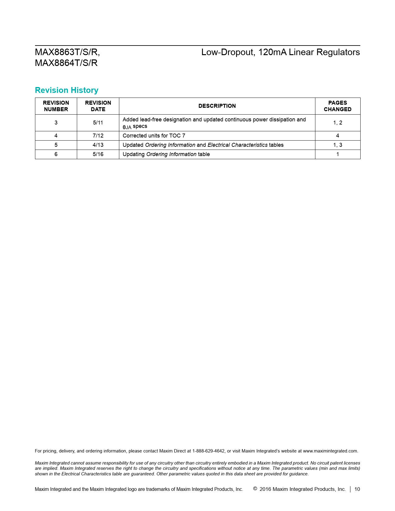 3 5/11 Added lead-free designation and updated continuous power dissipation and θJA specs 1, 2 4 7/12 Corrected units for TOC 7 4 5 4/13 Updated Ordering Information and Electrical Characteristics tables 1, 3 6 5/16 Updating Ordering Information table 1 For pricing, delivery, and ordering information, please contact Maxim Direct at 1-888-629-4642, or visit Maxim Integrated’s website at www.maximintegrated.com. Maxim Integrated cannot assume responsibility for use of any circuitry other than circuitry entirely embodied in a Maxim Integrated product. No circuit patent licenses are implied. Maxim Integrated reserves the right to change the circuitry and specifications without notice at any time. The parametric values (min and max limits) shown in the Electrical Characteristics table are guaranteed. Other parametric values quoted in this data sheet are provided for guidance. Maxim Integrated and the Maxim Integrated logo are trademarks of Maxim Integrated Products, Inc. © 2016 Maxim Integrated Products, Inc. │ 10