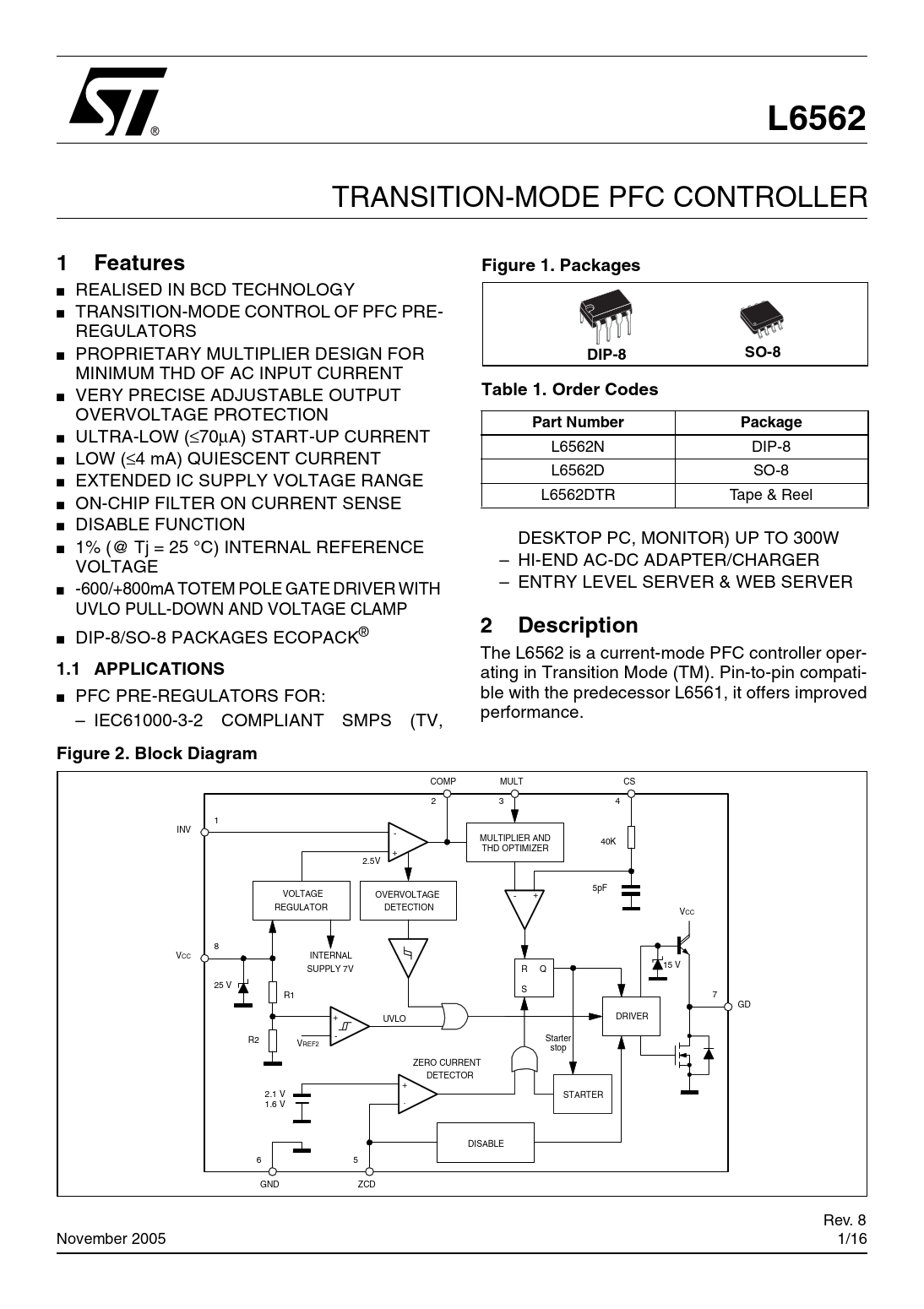 | Pages / Page | 16 / 1 — L6562. Features. Figure 1. Packages. DIP-8. SO-8. Table 1. Order Codes. … |