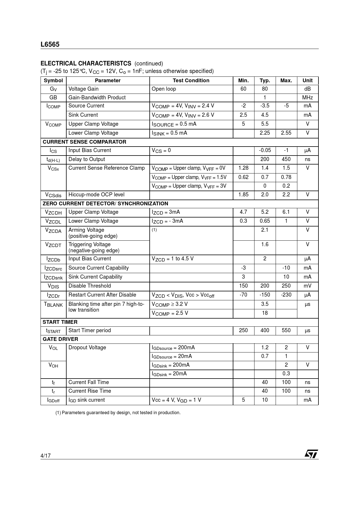 | Pages / Page | 17 / 4 — L6565. ELECTRICAL CHARACTERISTCS. Symbol. Parameter. Test Condition. Min. … |