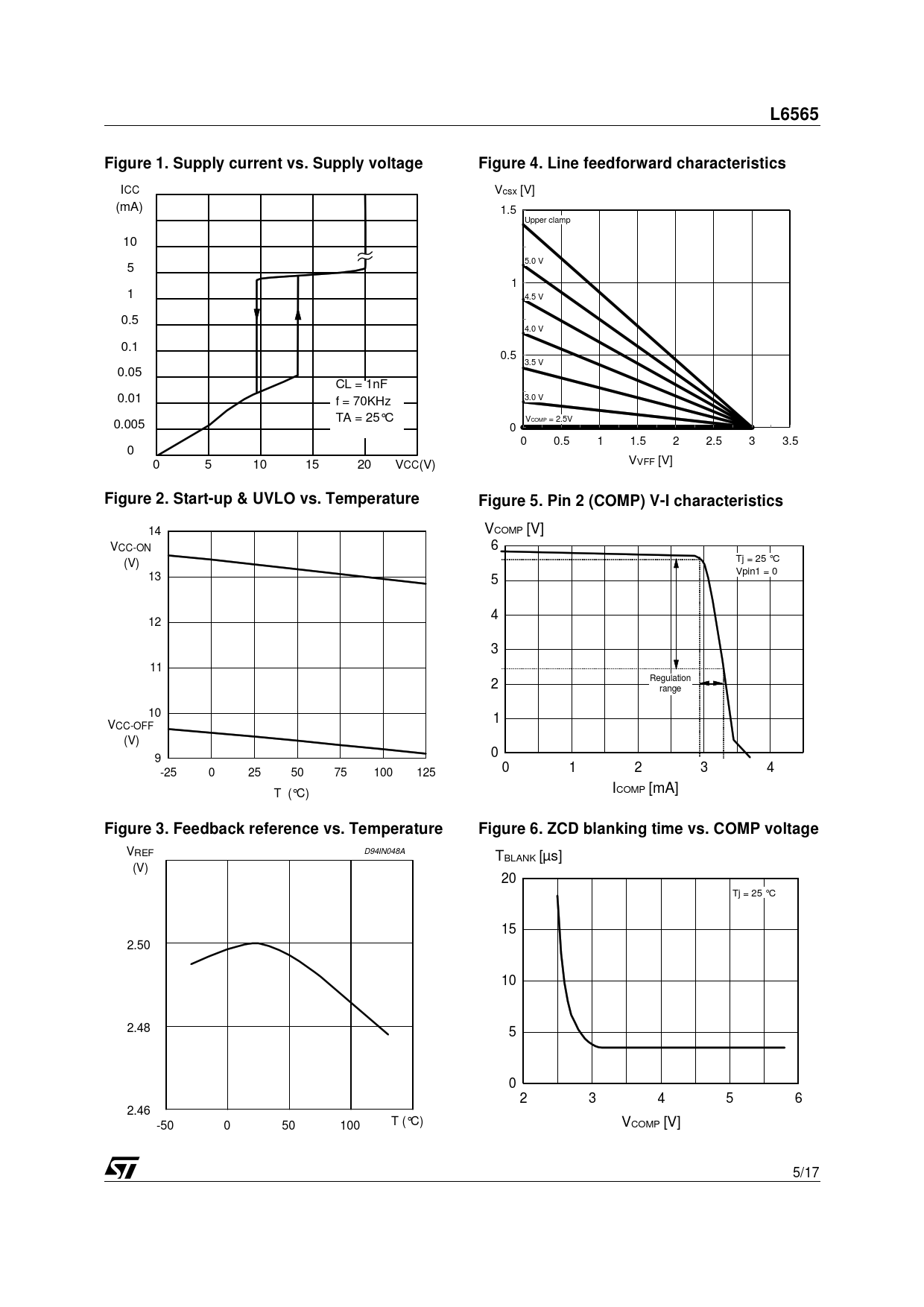 L6565. Figure 1. Supply current vs. Supply voltage. Figure 4. Line feedforward characteristics