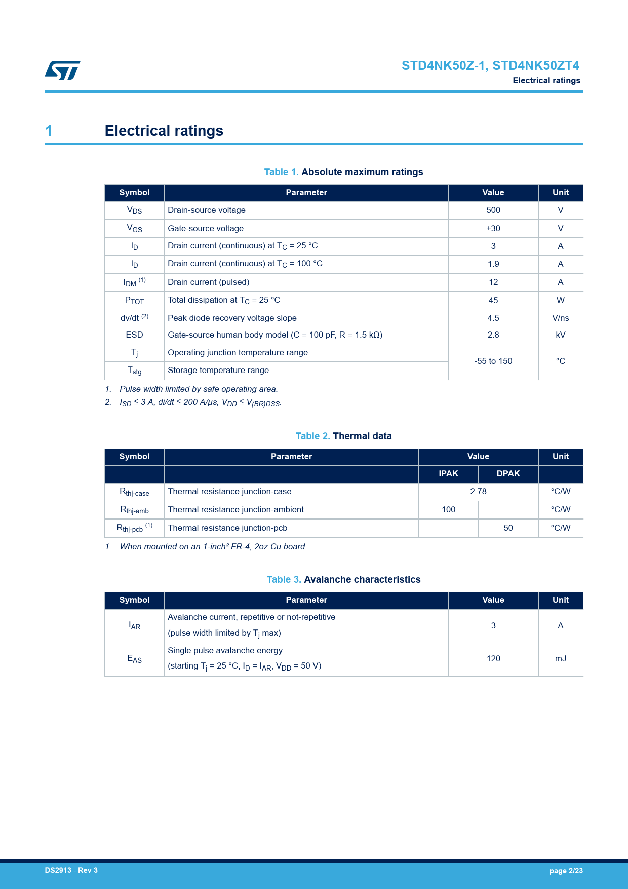 Pages / Page23 / 2 — STD4NK50Z-1, STD4NK50ZT4. Electrical ratings. Table 1. Absolute maximum …