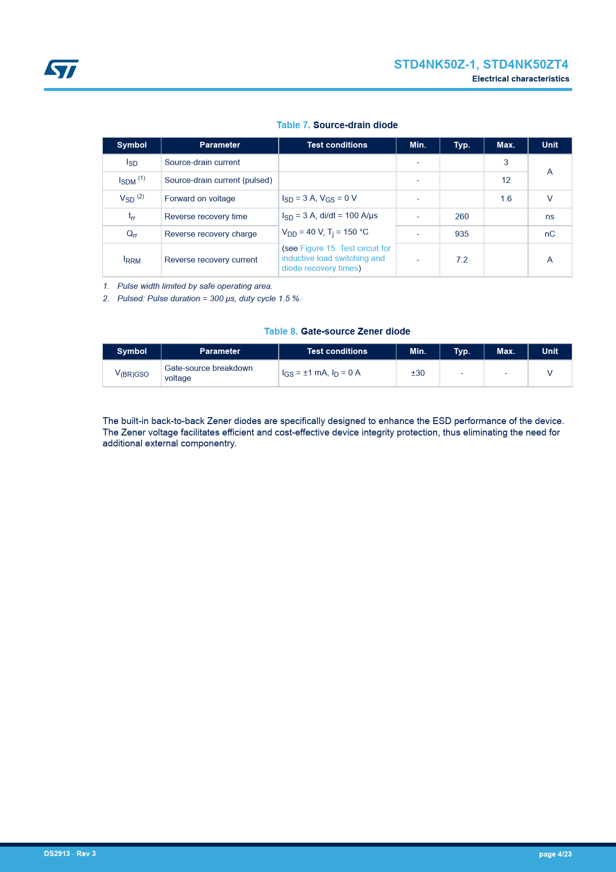 Pages / Page23 / 4 — STD4NK50Z-1, STD4NK50ZT4. Electrical characteristics. Table 7. …