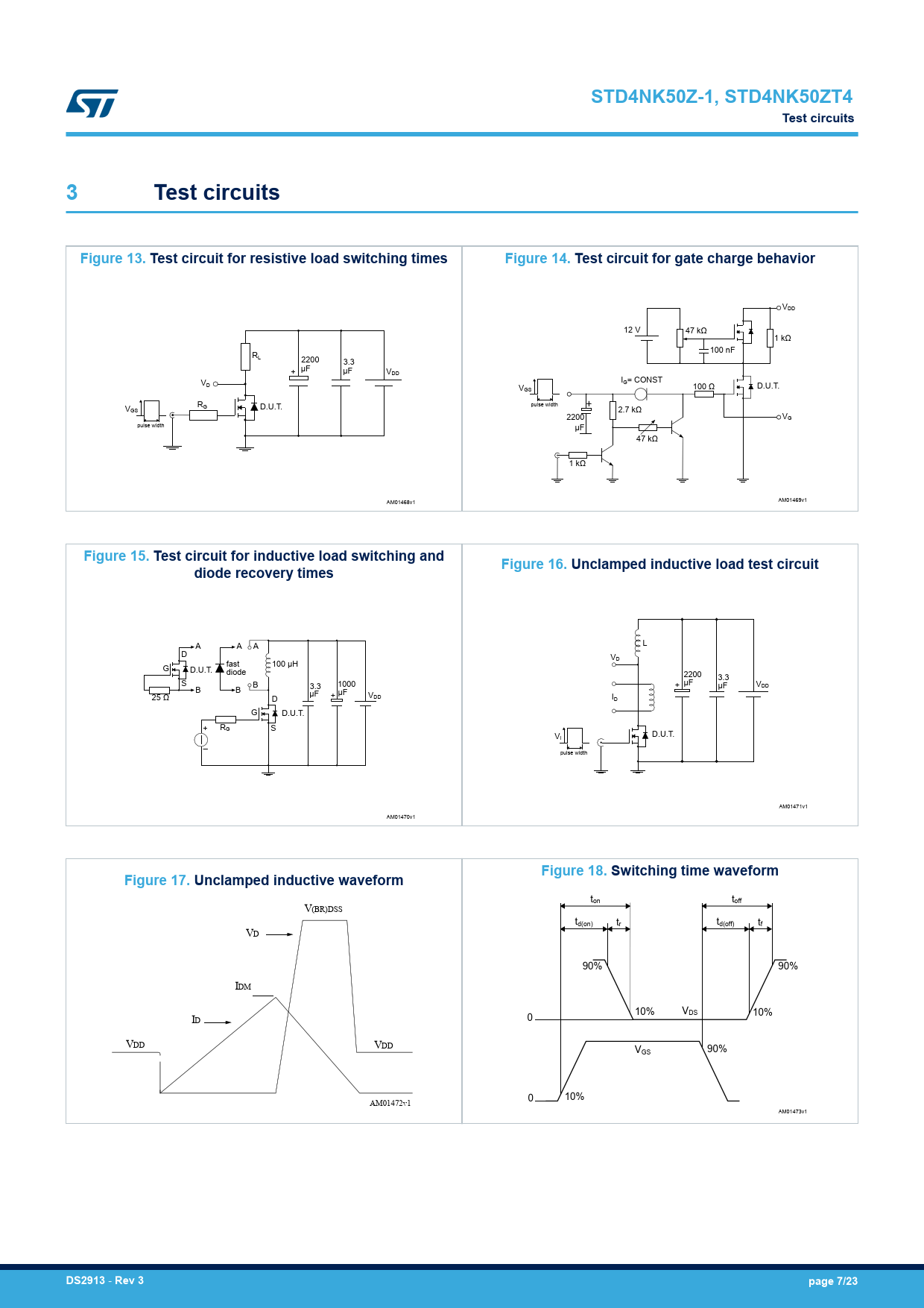 STD4NK50Z-1, STD4NK50ZT4Test circuits3Test circuitsFigure 13. Test circuit for resistive load switching timesFigure 14. Test circuit for gate charge behavior VDD 12 V 47 kΩ 1 kΩ 100 nF RL 2200 3.3 μF + μF VDD V I D G= CONST V 100 Ω D.U.T. GS R pulse width + G D.U.T. VGS 2.7 kΩ 2200 VG pulse width μF 47 kΩ 1 kΩ AM01468v1 AM01469v1 Figure 15. Test circuit for inductive load switching andFigure 16. Unclamped inductive load test circuitdiode recovery times A A A L D VD fast 100 µH G D.U.T. diode 2200 3.3 S B + µF µF V B B 3.3 1000 DD µF 25 Ω µF D + VDD ID G D.U.T. + RG S D.U.T. Vi _ pulse width AM01471v1 AM01470v1 Figure 18. Switching time waveformFigure 17. Unclamped inductive waveform ton toff V(BR)DSS td(on) tr td(off) tf VD 90% 90% IDM 10% VDS 10% ID 0 VDD VDD VGS 90% 0 10% AM01472v1 AM01473v1 DS2913 - Rev 3page 7/23 Document Outline 1 Electrical ratings 2 Electrical characteristics 2.1 Electrical characteristics (curves) 3 Test circuits 4 Package information 4.1 IPAK (TO-251) type A package information 4.2 IPAK (TO-251) type C package information 4.3 DPAK (TO-252) type A package information 4.4 DPAK (TO-252) type C package information 4.5 DPAK (TO-252) packing information 5 Ordering information Revision history