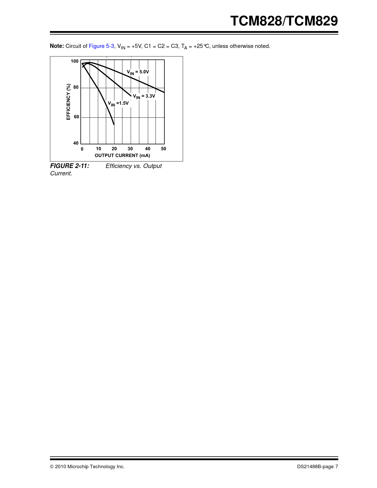 TCM828/TCM829. Note:. 100. = 5.0V. = 3.3V. =1.5V. EFFICIENCY (%). OUTPUT CURRENT (mA). FIGURE 2-11:
