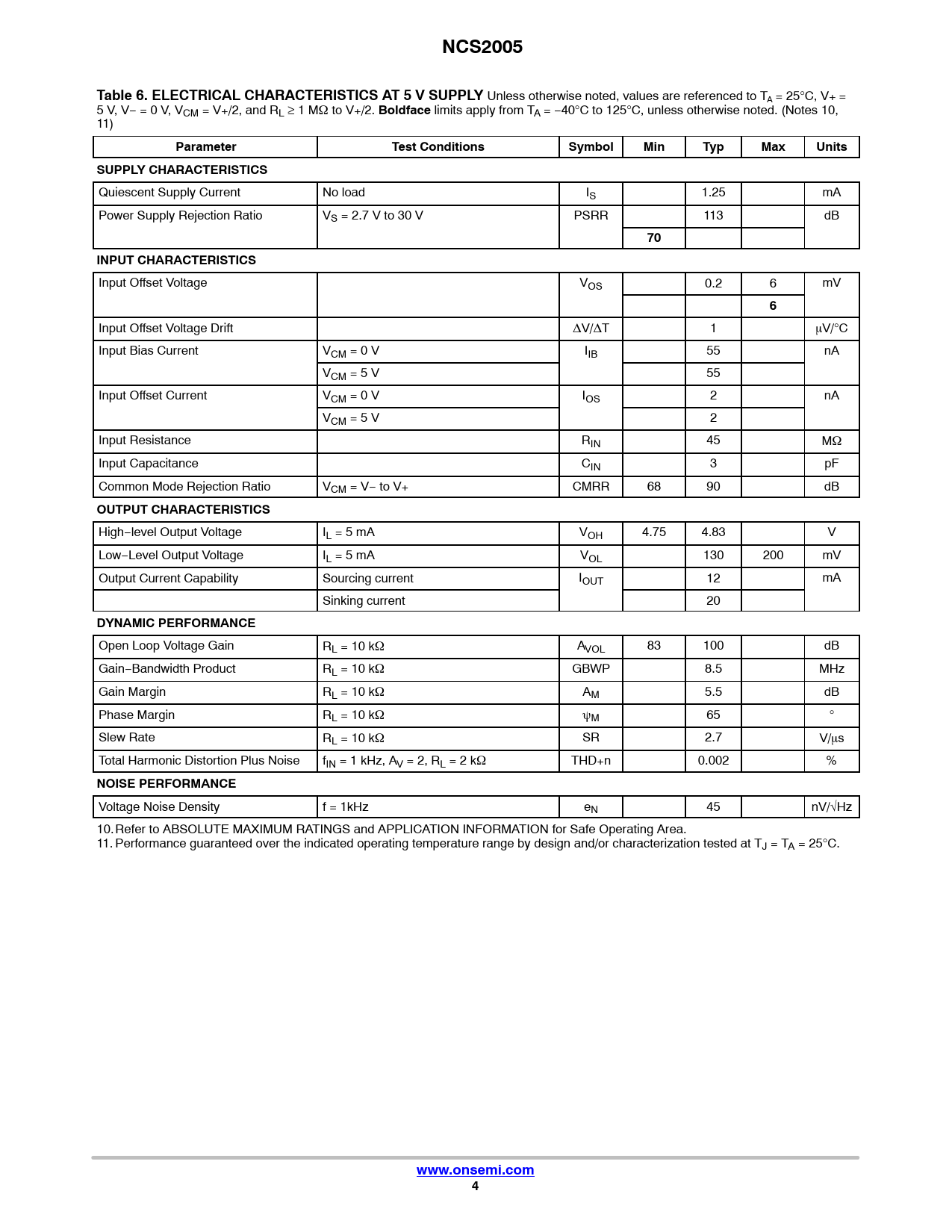 link to page 4 link to page 4 NCS2005Table 6. ELECTRICAL CHARACTERISTICS AT 5 V SUPPLY Unless otherwise noted, values are referenced to TA = 25°C, V+ = 5 V, V− = 0 V, VCM = V+/2, and RL ≥ 1 MW to V+/2. Boldface limits apply from TA = −40°C to 125°C, unless otherwise noted. (Notes 10, 11) ParameterTest ConditionsSymbolMinTypMaxUnitsSUPPLY CHARACTERISTICS Quiescent Supply Current No load IS 1.25 mA Power Supply Rejection Ratio VS = 2.7 V to 30 V PSRR 113 dB 70INPUT CHARACTERISTICS Input Offset Voltage VOS 0.2 6 mV 6 Input Offset Voltage Drift DV/DT 1 mV/°C Input Bias Current VCM = 0 V IIB 55 nA VCM = 5 V 55 Input Offset Current VCM = 0 V IOS 2 nA VCM = 5 V 2 Input Resistance RIN 45 MW Input Capacitance CIN 3 pF Common Mode Rejection Ratio VCM = V− to V+ CMRR 68 90 dB OUTPUT CHARACTERISTICS High−level Output Voltage IL = 5 mA VOH 4.75 4.83 V Low−Level Output Voltage IL = 5 mA VOL 130 200 mV Output Current Capability Sourcing current IOUT 12 mA Sinking current 20 DYNAMIC PERFORMANCE Open Loop Voltage Gain RL = 10 kW AVOL 83 100 dB Gain−Bandwidth Product RL = 10 kW GBWP 8.5 MHz Gain Margin RL = 10 kW AM 5.5 dB Phase Margin RL = 10 kW yM 65 ° Slew Rate RL = 10 kW SR 2.7 V/ms Total Harmonic Distortion Plus Noise fIN = 1 kHz, AV = 2, RL = 2 kW THD+n 0.002 % NOISE PERFORMANCE Voltage Noise Density f = 1kHz eN 45 nV/√Hz 10.Refer to ABSOLUTE MAXIMUM RATINGS and APPLICATION INFORMATION for Safe Operating Area. 11. Performance guaranteed over the indicated operating temperature range by design and/or characterization tested at TJ = TA = 25°C. www.onsemi.com4