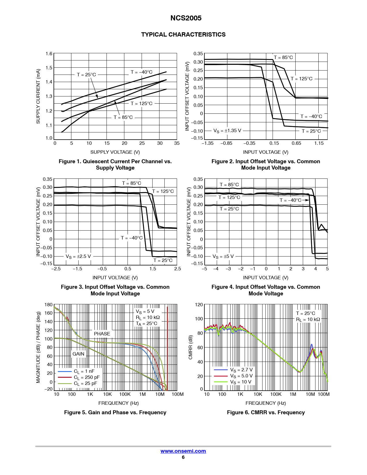 NCS2005TYPICAL CHARACTERISTICS 1.6 0.35 T = 85°C 0.30 1.5 T = −40°C 0.25 T = 25°C T = 125 1.4 0.20 °C TAGE (mV) 0.15 1.3 0.10 T = 125°C 0.05 Y CURRENT (mA) 1.2 0 T = 85°C T = −40°C SUPPL 1.1 −0.05 INPUT OFFSET VOL −0.10 VS = ±1.35 V T = 25°C 1.0 −0.15 0 5 10 15 20 25 30 35 −1.35 −0.85 −0.35 0.15 0.65 1.15 SUPPLY VOLTAGE (V) INPUT VOLTAGE (V) Figure 1. Quiescent Current Per Channel vs.Figure 2. Input Offset Voltage vs. CommonSupply VoltageMode Input Voltage 0.35 0.35 T = 85°C 0.30 0.30 T = 85°C T = 125°C 0.25 0.25 T = 125°C T = −40°C 0.20 0.20 TAGE (mV) TAGE (mV) T = 25°C 0.15 0.15 0.10 0.10 0.05 0.05 0 T = −40°C 0 −0.05 −0.05 INPUT OFFSET VOL−0.10 INPUT OFFSET VOL VS = ±2.5 V −0.10 V T = 25 S = ±5 V −0.15 °C −0.15 −2.5 −1.5 −0.5 0.5 1.5 2.5 −5 −4 −3 −2 −1 0 1 2 3 4 5 INPUT VOLTAGE (V) INPUT VOLTAGE (V) Figure 3. Input Offset Voltage vs. CommonFigure 4. Input Offset Voltage vs. CommonMode Input VoltageMode Voltage 180 120 160 VS = 5 V T = 25°C RL = 10 kW 100 RL = 10 kW 140 TA = 25°C 120 PHASE 80 100 80 60 60 GAIN CMRR (dB) 40 40 V C S = 2.7 V 20 L = 1 nF C 20 VS = 5.0 V L = 250 pF MAGNITUDE (dB) / PHASE (deg) 0 V C S = 10 V L = 25 pF −20 0 10 100 1K 10K 100K 1M 10M 100M 10 100 1K 10K 100K 1M 10M 100M FREQUENCY (Hz) FREQUENCY (Hz) Figure 5. Gain and Phase vs. FrequencyFigure 6. CMRR vs. Frequencywww.onsemi.com6