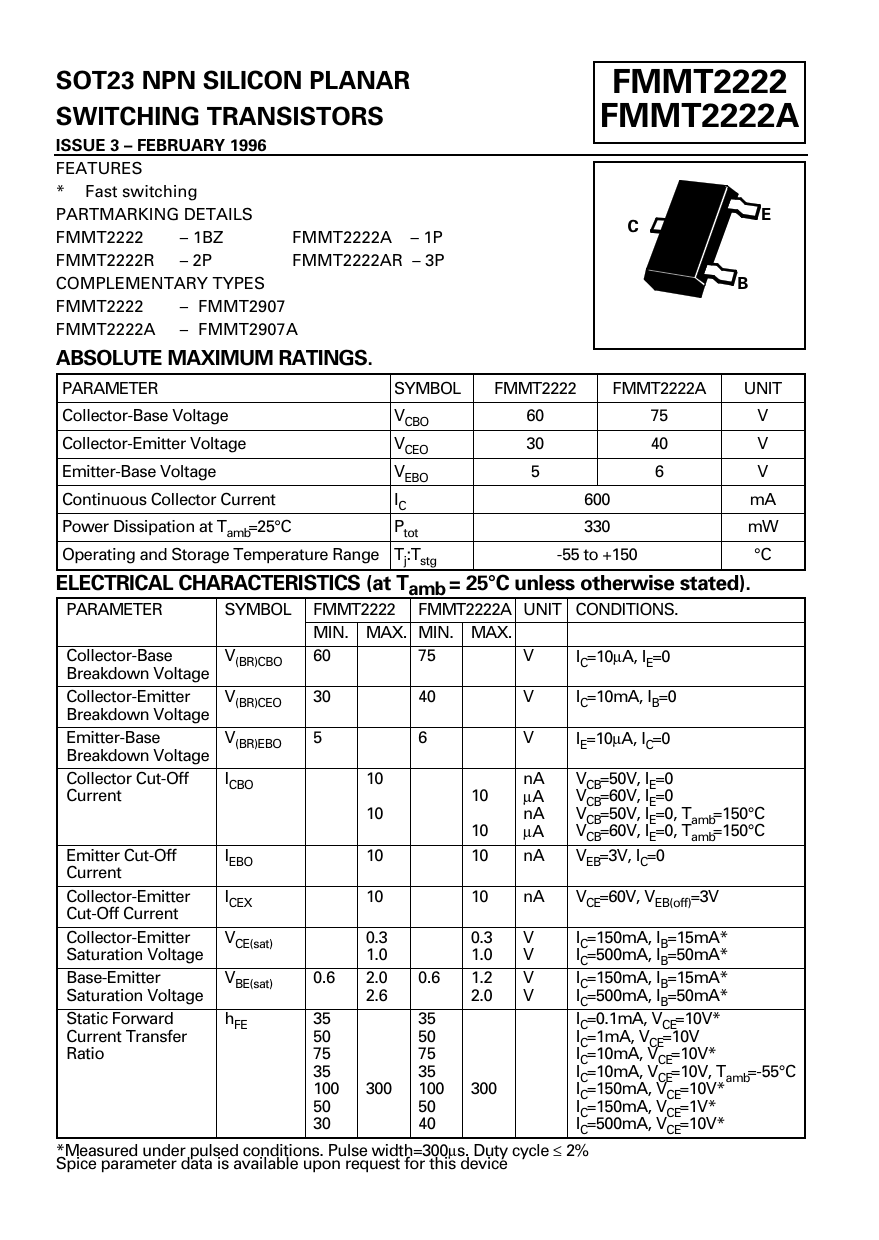 FMMT2222. SOT23. NPN. SILICON. PLANAR. FMMT2222. FMMT2222A. SWITCHING. TRANSISTORS. FMMT2222A. ISSUE. 3. –. FEBRUARY. 1996. FEATURES. ELECTRICAL