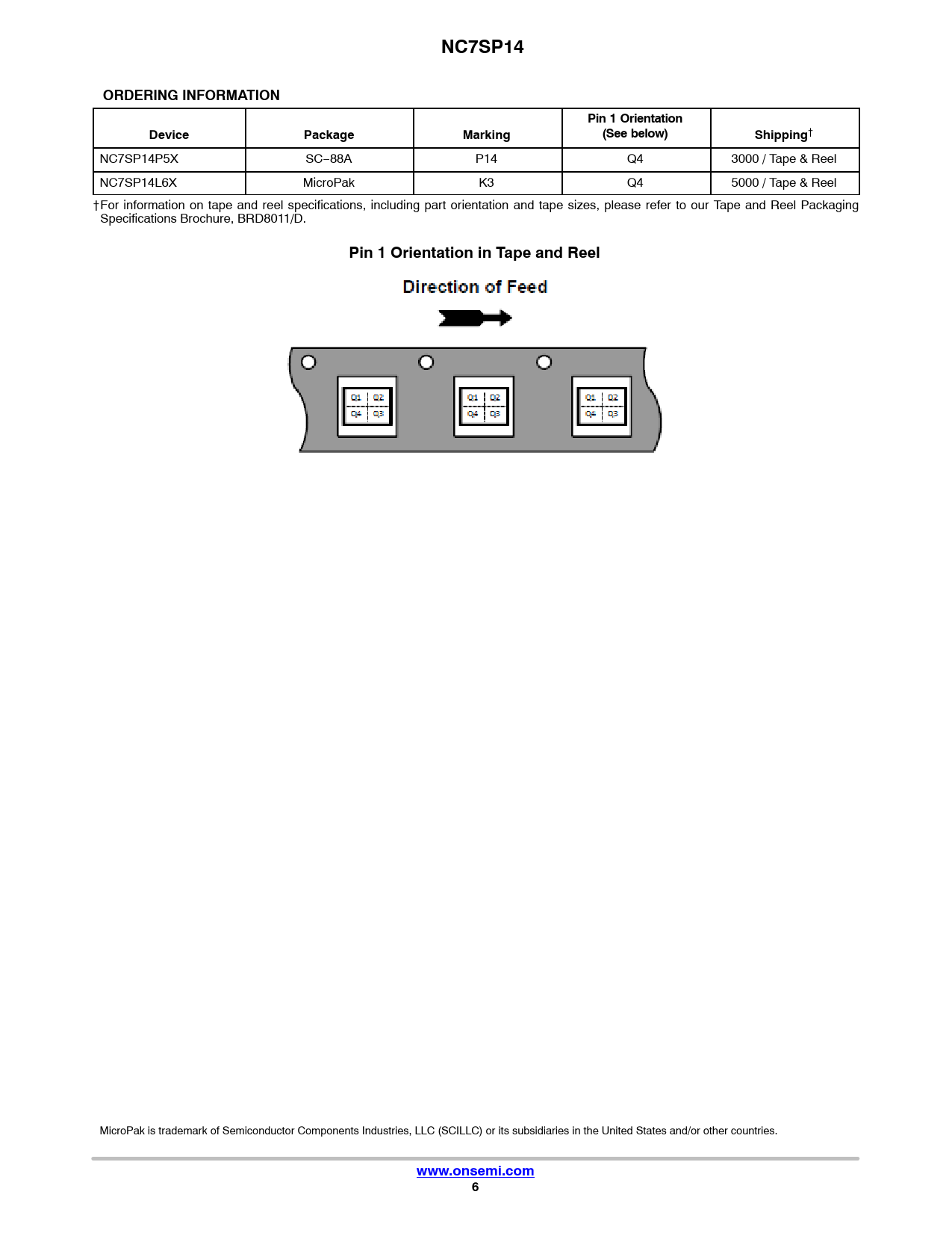 NC7SP14ORDERING INFORMATIONPin 1 OrientationDevicePackageMarking(See below)Shipping † NC7SP14P5X SC−88A P14 Q4 3000 / Tape & Reel NC7SP14L6X MicroPak K3 Q4 5000 / Tape & Reel †For information on tape and reel specifications, including part orientation and tape sizes, please refer to our Tape and Reel Packaging Specifications Brochure, BRD8011/D. Pin 1 Orientation in Tape and Reel MicroPak is trademark of Semiconductor Components Industries, LLC (SCILLC) or its subsidiaries in the United States and/or other countries. www.onsemi.com6