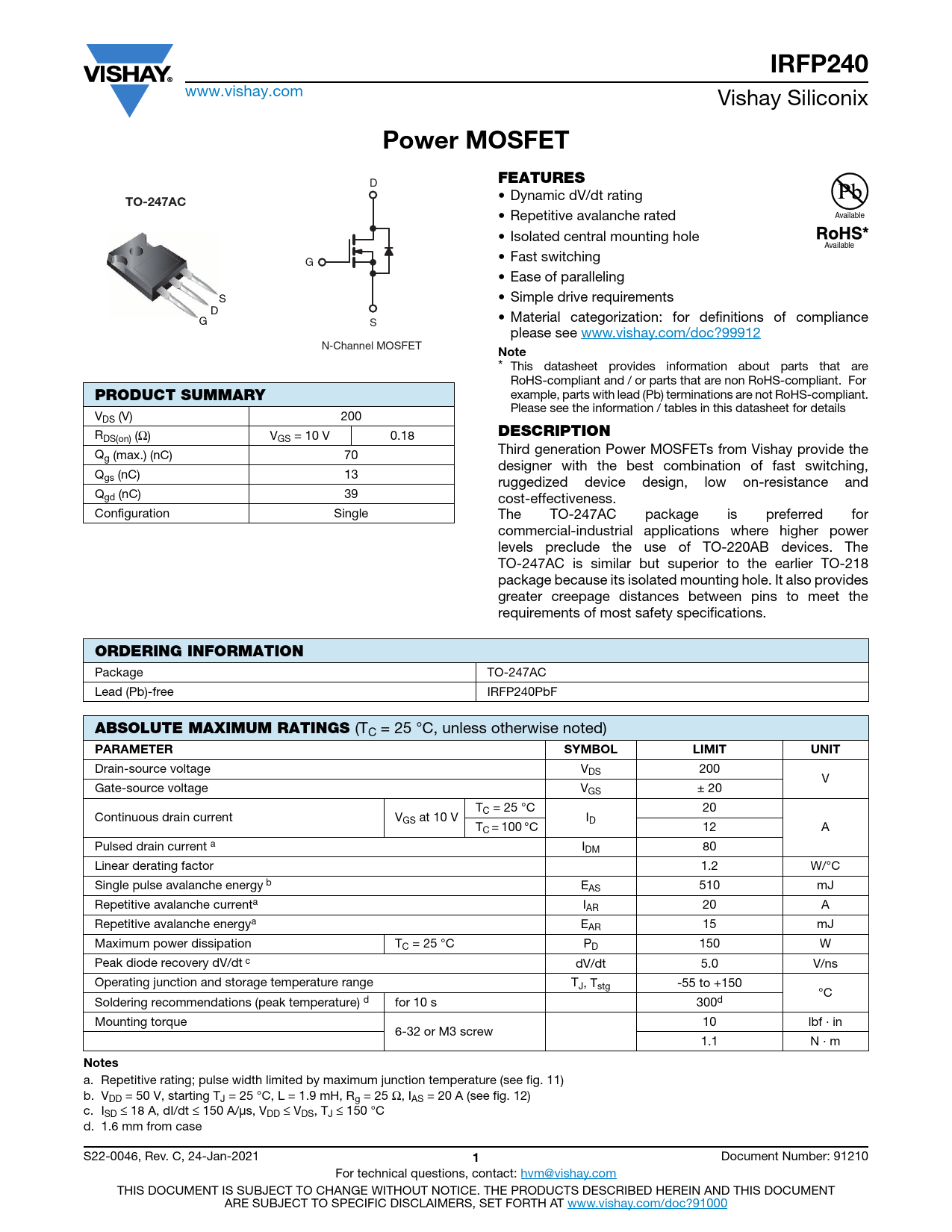 IRFP240 www.vishay.com Vishay Siliconix Power MOSFET D FEATURES • Dynamic dV/dt rating TO-247AC • Repetitive avalanche rated Available • Isolated central mounting hole Available • Fast switching G • Ease of paralleling S • Simple drive requirements D • Material categorization: for definitions of compliance G S please see www.vishay.com/doc?99912 N-Channel MOSFET Note * This datasheet provides information about parts that are RoHS-compliant and / or parts that are non RoHS-compliant. For example, parts with lead (Pb) terminations are not RoHS-compliant. PRODUCT SUMMARY Please see the information / tables in this datasheet for details VDS (V) 200 R DESCRIPTION DS(on) (Ω) VGS = 10 V 0.18 Third generation Power MOSFETs from Vishay provide the Qg (max.) (nC) 70 designer with the best combination of fast switching, Qgs (nC) 13 ruggedized device design, low on-resistance and Qgd (nC) 39 cost-effectiveness. Configuration Single The TO-247AC package is preferred for commercial-industrial applications where higher power levels preclude the use of TO-220AB devices. The TO-247AC is similar but superior to the earlier TO-218 package because its isolated mounting hole. It also provides greater creepage distances between pins to meet the requirements of most safety specifications. ORDERING INFORMATION Package TO-247AC Lead (Pb)-free IRFP240PbF ABSOLUTE MAXIMUM RATINGS (TC = 25 °C, unless otherwise noted) PARAMETER SYMBOLLIMITUNIT Drain-source voltage VDS 200 V Gate-source voltage VGS ± 20 TC = 25 °C 20 Continuous drain current VGS at 10 V ID TC = 100 °C 12 A Pulsed drain current a IDM 80 Linear derating factor 1.2 W/°C Single pulse avalanche energy b EAS 510 mJ Repetitive avalanche currenta IAR 20 A Repetitive avalanche energya EAR 15 mJ Maximum power dissipation TC = 25 °C PD 150 W Peak diode recovery dV/dt c dV/dt 5.0 V/ns Operating junction and storage temperature range TJ, Tstg -55 to +150 °C Soldering recommendations (peak temperature) d for 10 s 300d Mounting torque 10 lbf · in 6-32 or M3 screw 1.1 N · m Notes a. Repetitive rating; pulse width limited by maximum junction temperature (see fig. 11) b. VDD = 50 V, starting TJ = 25 °C, L = 1.9 mH, Rg = 25 Ω, IAS = 20 A (see fig. 12) c. ISD ≤ 18 A, dI/dt ≤ 150 A/μs, VDD ≤ VDS, TJ ≤ 150 °C d. 1.6 mm from case S22-0046, Rev. C, 24-Jan-2021 1 Document Number: 91210 For technical questions, contact: hvm@vishay.com THIS DOCUMENT IS SUBJECT TO CHANGE WITHOUT NOTICE. THE PRODUCTS DESCRIBED HEREIN AND THIS DOCUMENT ARE SUBJECT TO SPECIFIC DISCLAIMERS, SET FORTH AT www.vishay.com/doc?91000