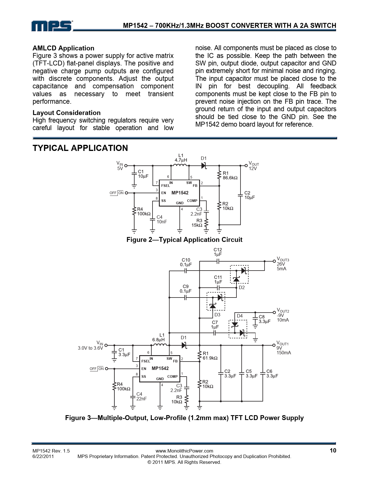 | Pages / Page | 11 / 10 — MP1542 – 700KHz/1.3MHz BOOST CONVERTER WITH A 2A SWITCH. AMLCD … |