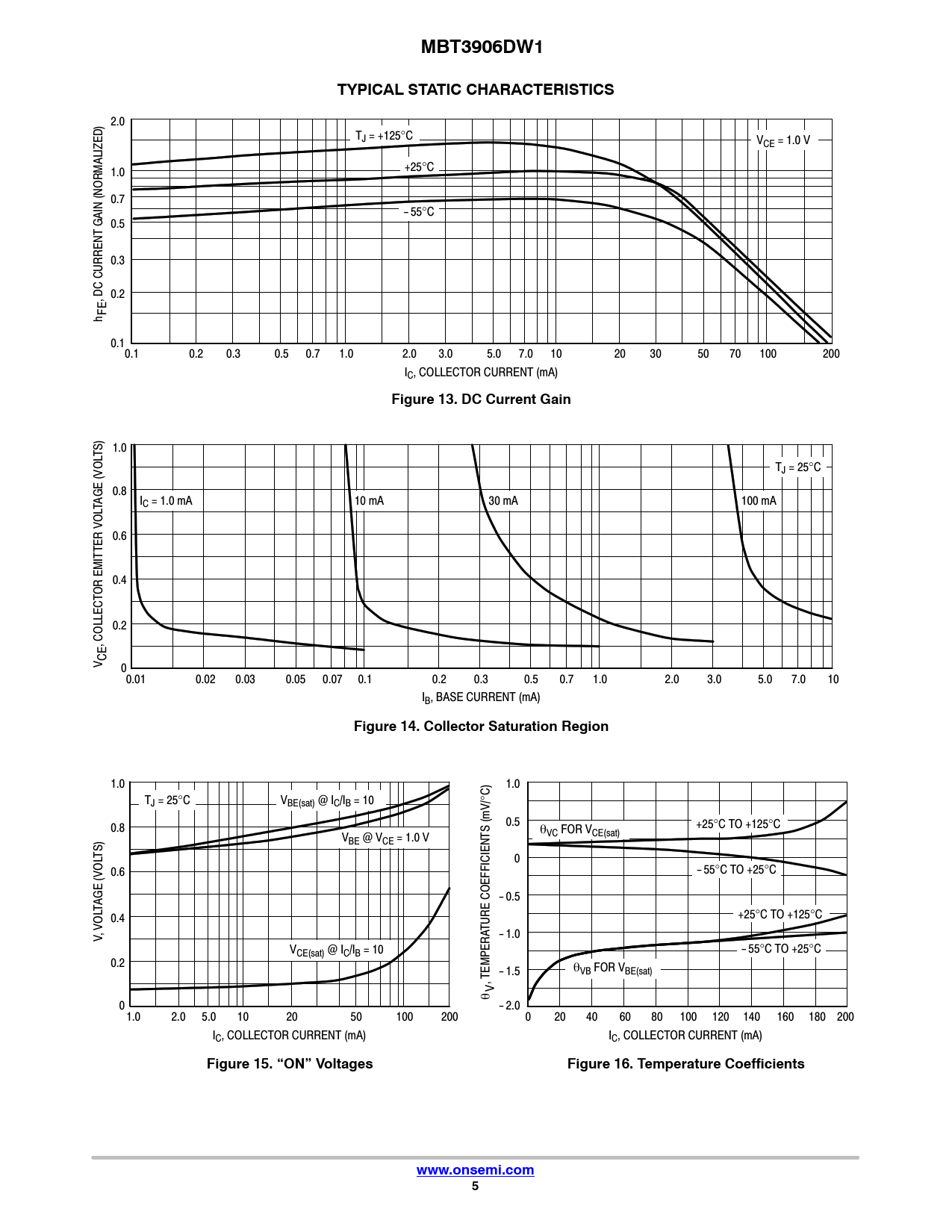 MBT3906DW1. TYPICAL STATIC CHARACTERISTICS. Figure 13. DC Current Gain. Figure 14. Collector Saturation Region