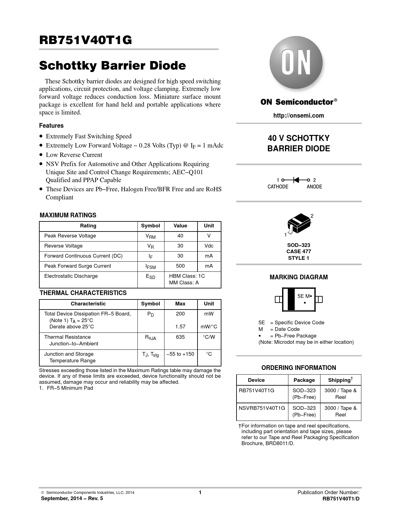 September, 2014 − Rev. 5 RB751V40T1/D