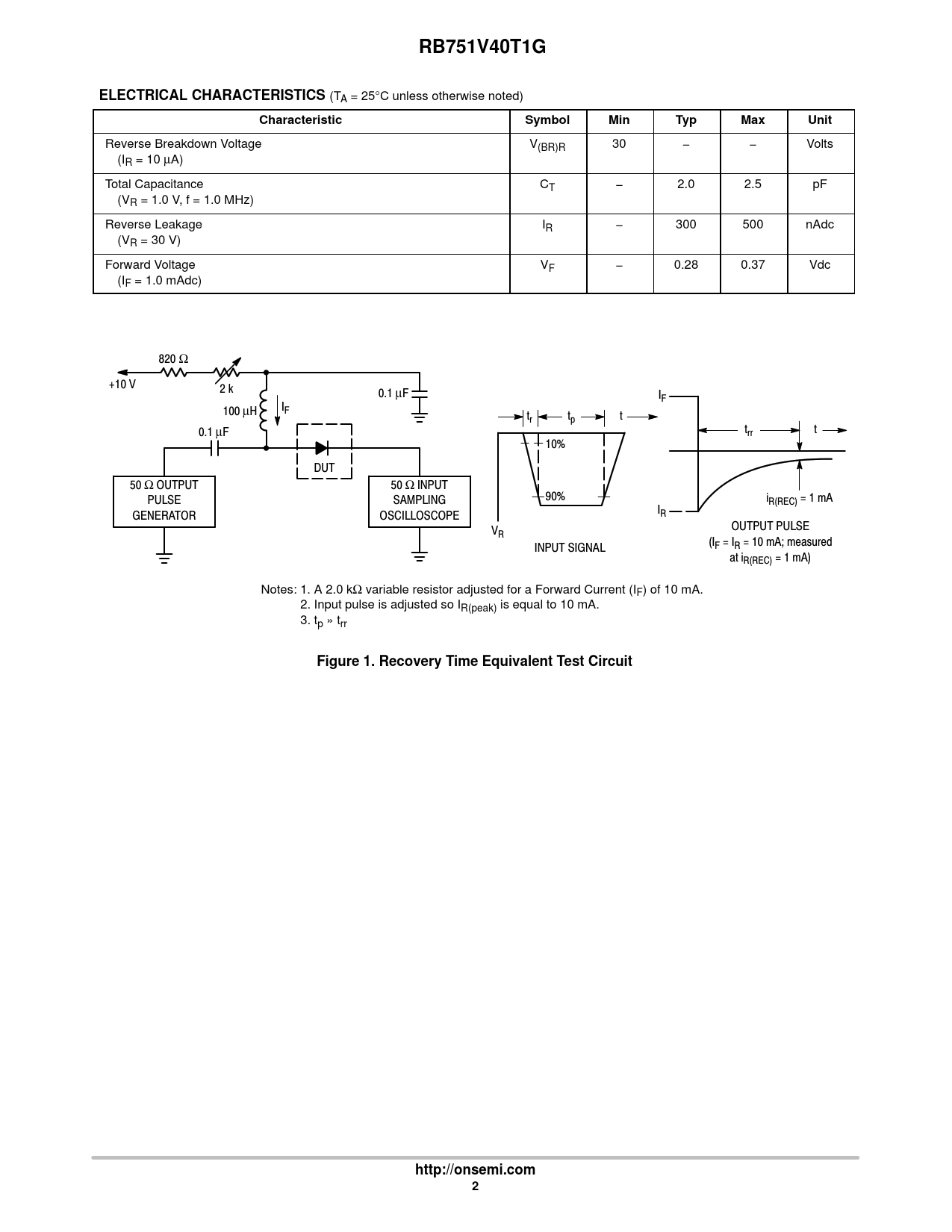 RB751V40T1G ELECTRICAL CHARACTERISTICS Characteristic Symbol Min Typ Max Unit Figure 1 Recovery Time Equivalent Test Circuit