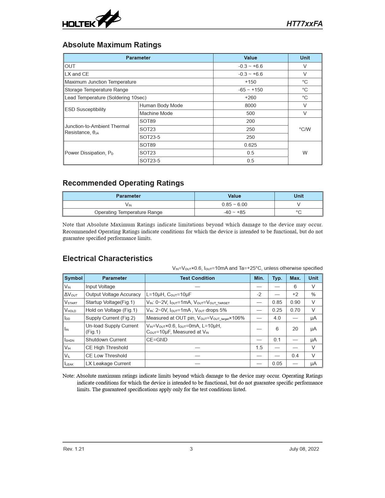 HT77xxFA. Absolute Maximum Ratings. Parameter. Value. Unit. Recommended Operating Ratings. Electrical Characteristics. Symbol