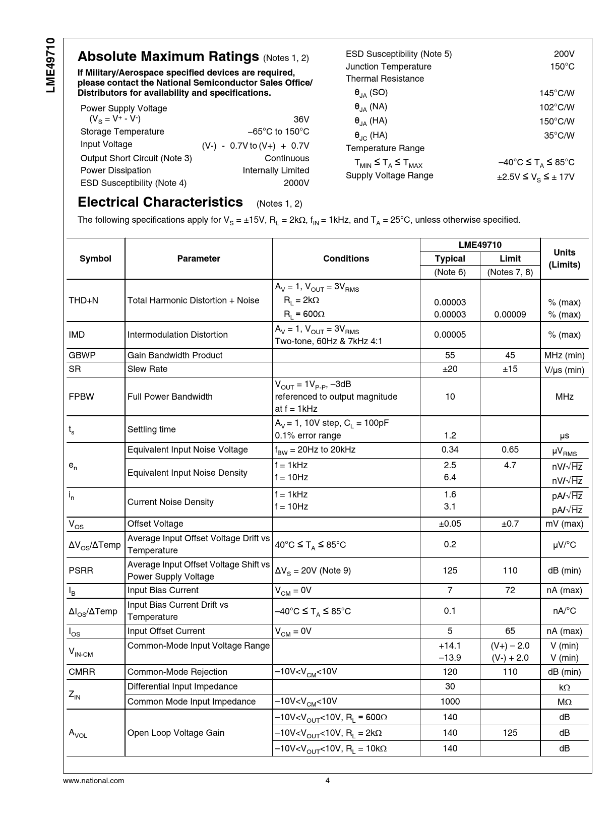 (Note 6) (Notes 7, 8) A = 1, V = 3V V OUT RMS THD+N Total Harmonic Distortion + Noise R = 2kΩ L 0.00003 % (max) R = 600Ω L 0.00003 0.00009 % (max) A = 1, V = 3V IMD Intermodulation Distortion V OUT RMS 0.00005 % (max) Two-tone, 60Hz & 7kHz 4:1 GBWP Gain Bandwidth Product 55 45 MHz (min) SR Slew Rate ±20 ±15 V/μs (min) V = 1V , –3dB OUT P-P FPBW Full Power Bandwidth referenced to output magnitude 10 MHz at f = 1kHz A = 1, 10V step, C = 100pF t V L s Settling time 0.1% error range 1.2 μs Equivalent Input Noise Voltage f = 20Hz to 20kHz 0.34 0.65 BW μVRMS en f = 1kHz 2.5 4.7  nV