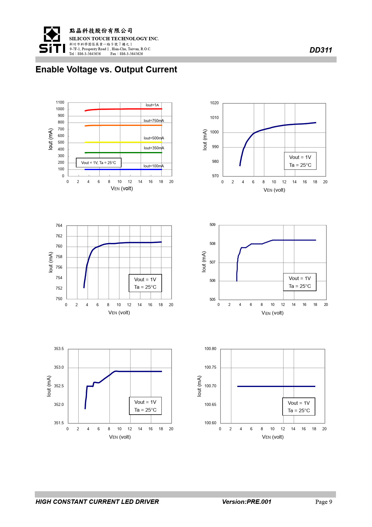 SILICON TOUCH TECHNOLOGY INC. DD311. Enable Voltage vs. Output Current. HIGH CONSTANT CURRENT LED DRIVER. Version:PRE.001