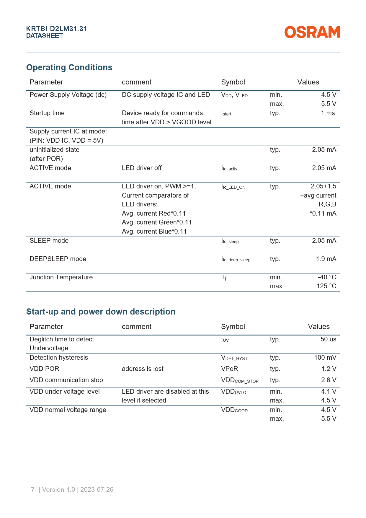 KRTBI D2LM31.31 DATA A SHEET Operating Conditions Parameter comment Symbol Values Power Supply Voltage (dc) DC supply voltage IC and LED VDD, VLED min. 4.5 V max. 5.5 V Startup time Device ready for commands, tstart typ. 1 ms time after VDD > VGOOD level Supply current IC at mode: (PIN: VDD IC, VDD = 5V) uninitialized state typ. 2.05 mA (after POR) ACTIVE mode LED driver off IIc_activ typ. 2.05 mA ACTIVE mode LED driver on, PWM >=1, IIc_LED_ON typ. 2.05+1.5 Current comparators of +avg current LED drivers: R,G,B Avg. current Red*0.11 *0.11 mA Avg. current Green*0.11 Avg. current Blue*0.11 SLEEP mode IIc_sleep typ. 2.05 mA DEEPSLEEP mode IIc_deep_sleep typ. 1.9 mA Junction Temperature Tj min. -40 °C max. 125 °C Start-up and power down description Parameter comment Symbol Values Deglitch time to detect tUV typ. 50 us Undervoltage Detection hysteresis VDET_HYST typ. 100 mV VDD POR address is lost VPoR typ. 1.2 V VDD communication stop VDDCOM_STOP typ. 2.6 V VDD under voltage level LED driver are disabled at this VDDUVLO min. 4.1 V level if selected max. 4.5 V VDD normal voltage range VDDGOOD min. 4.5 V max. 5.5 V 7 | Version 1.0 | 2023-07-26