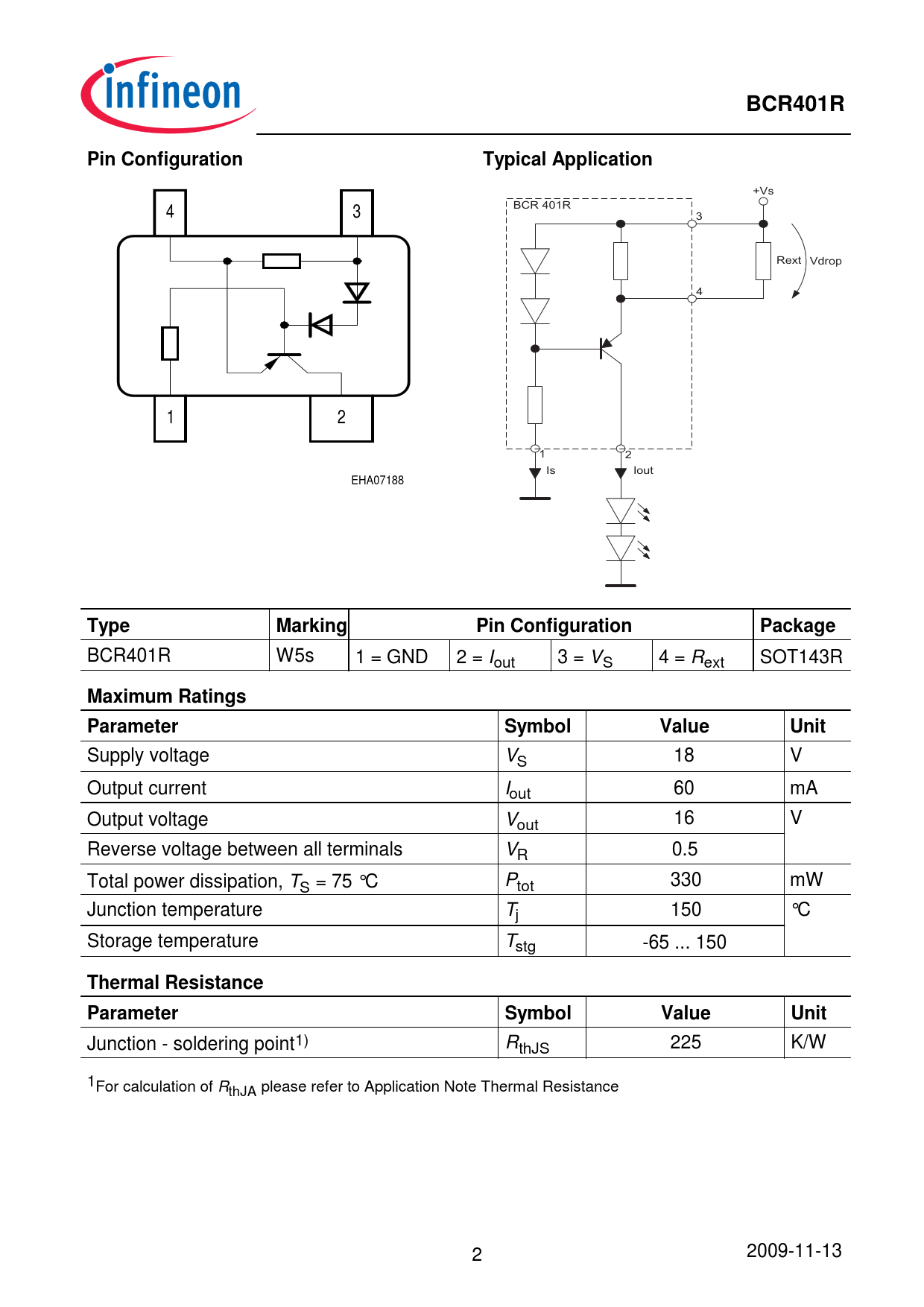 BCR401R. Pin Configuration. Typical Application. Type. Marking. Package. Maximum Ratings. Parameter. Symbol. Value. Unit. Thermal Resistance